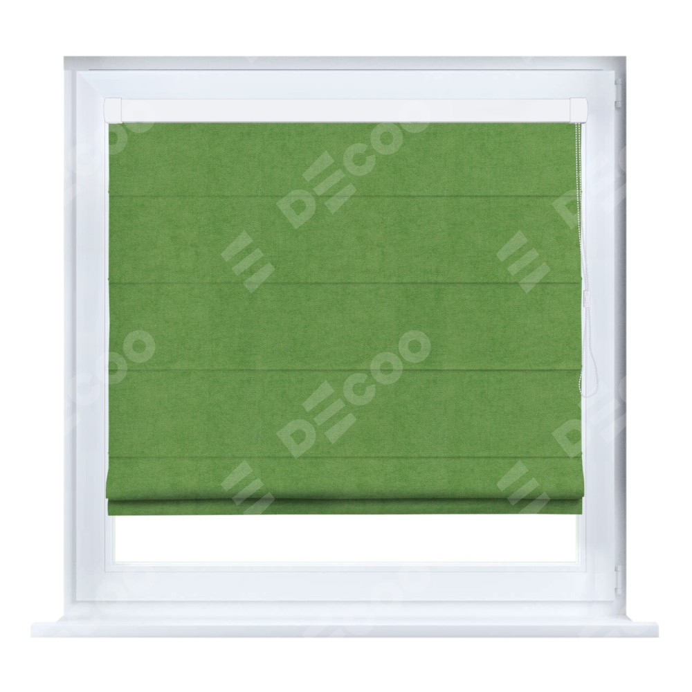 Римская штора кассетного типа, производителя «Cortin», устанавливается только на пластиковые окна и прилегает к стеклопакету, пошита из ткани вельвет салатовый, артикул 87072.