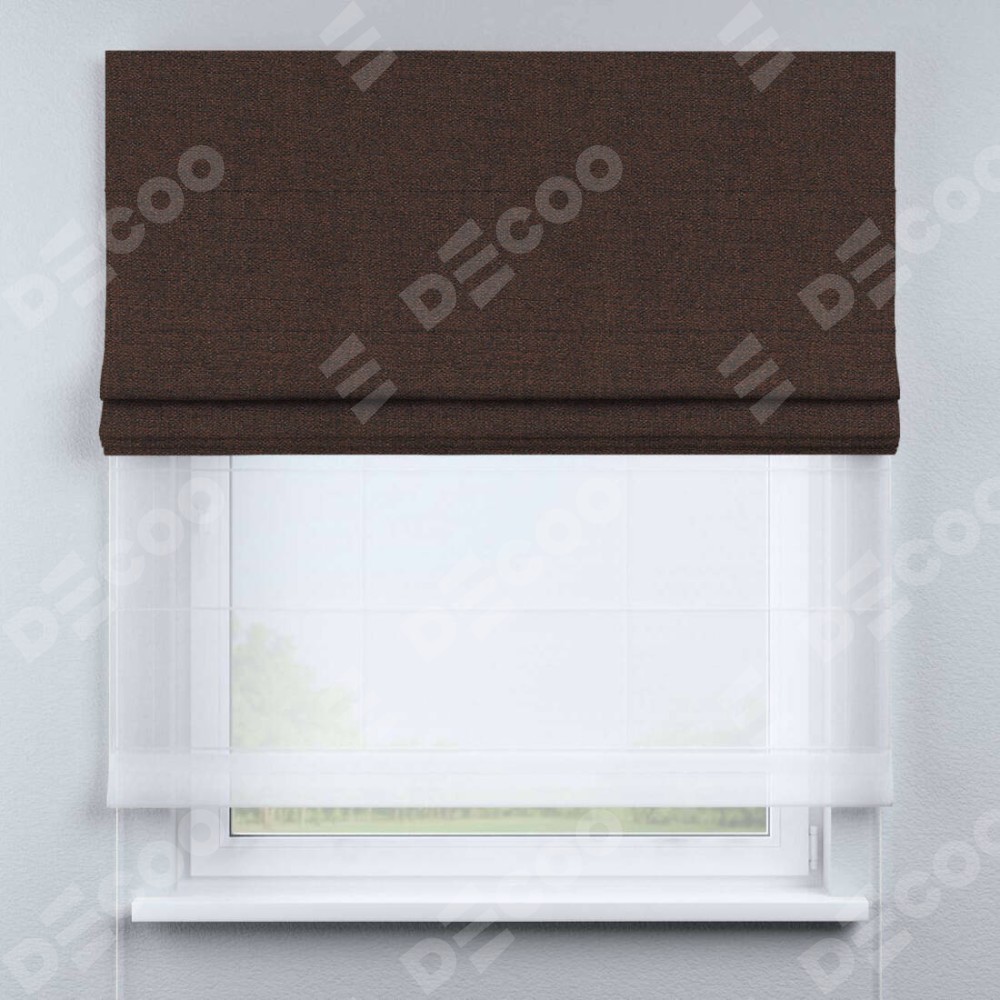 Римская штора день-ночь производителя «Cortin», используется для проёма, пошита из двух полотен, с лицевой стороны лён коричневый артикул 53443, вторая ткань тюль (по стандарту комплектуется тюль белого цвета артикул V-01). Имеет универсальный механизм и подходит для монтажа: на потолок, на стену и в нишу.