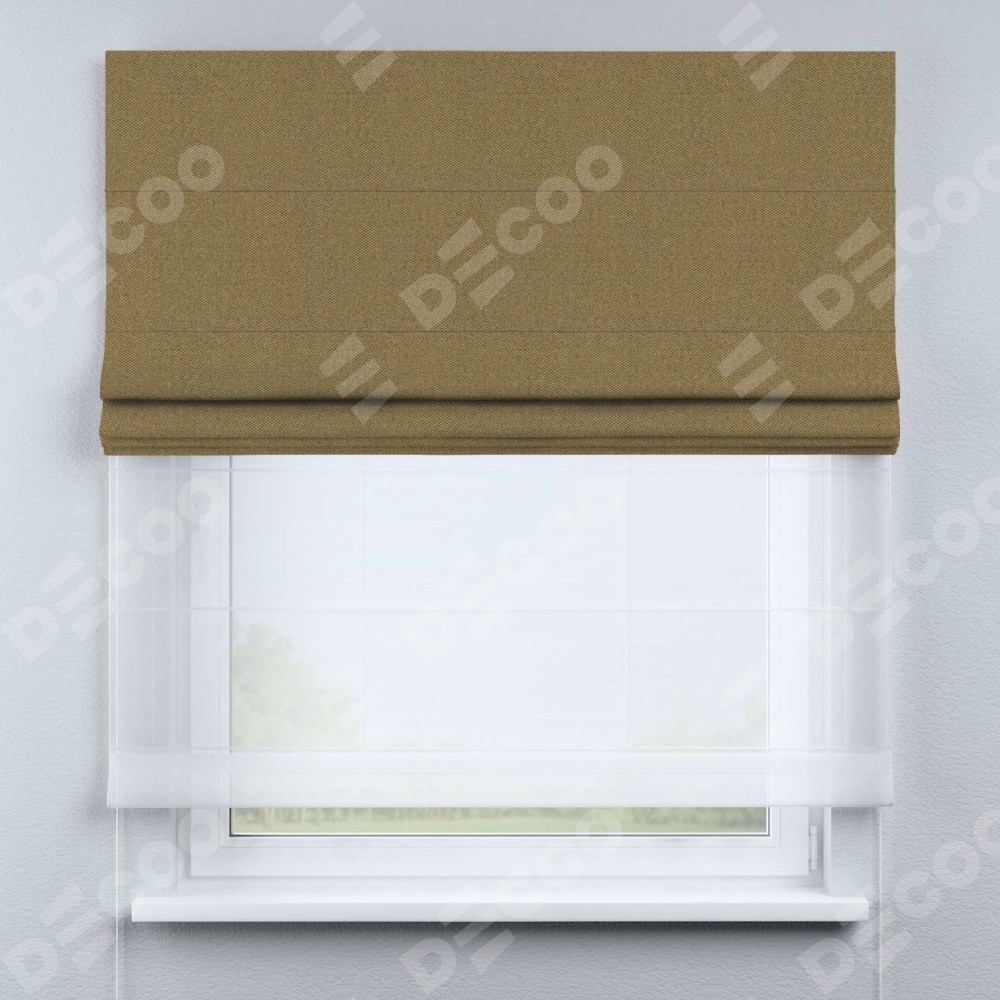 Римская штора день-ночь производителя «Cortin», используется для проёма, пошита из двух полотен, с лицевой стороны лён димаут оливковый артикул 16243, вторая ткань тюль (по стандарту комплектуется тюль белого цвета артикул V-01). Имеет универсальный механизм и подходит для монтажа: на потолок, на стену и в нишу.