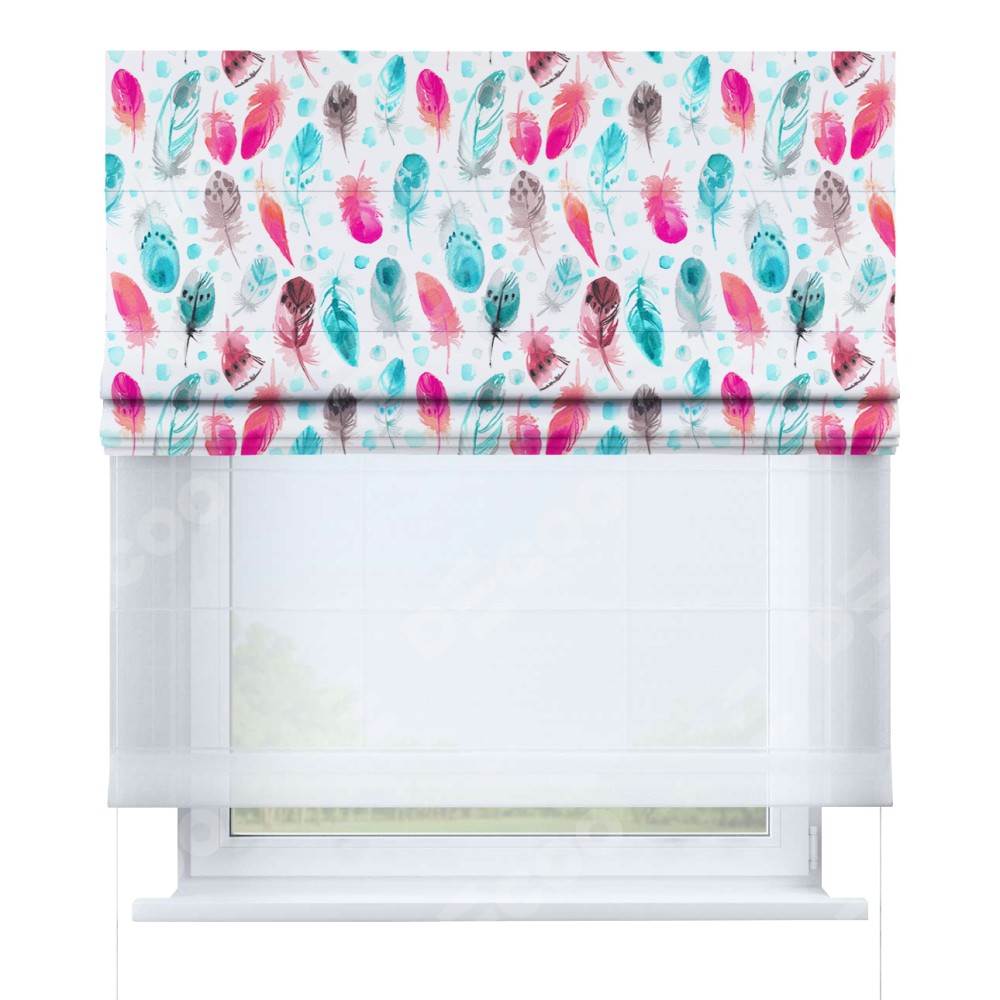 Римская штора день-ночь производителя «Cortin», используется для проёма, пошита из двух полотен, с лицевой блэкаут с нанесением сублимационной печати «Перья», вторая ткань тюль (по стандарту комплектуется тюль белого цвета артикул V-01). Имеет универсальный механизм и подходит для монтажа: на потолок, на стену и в нишу.