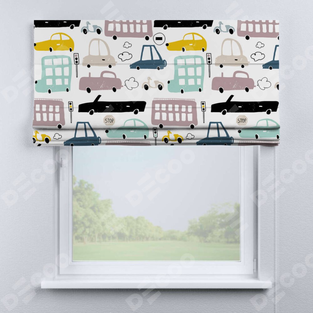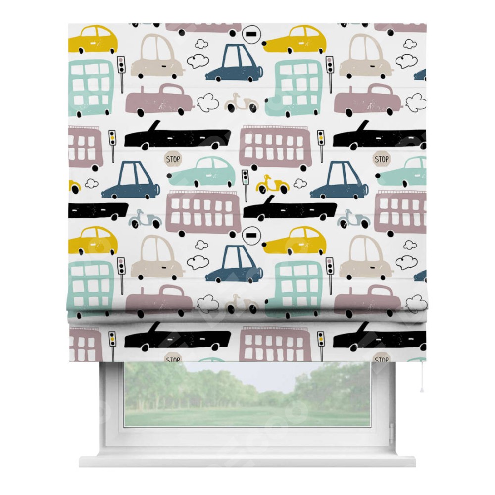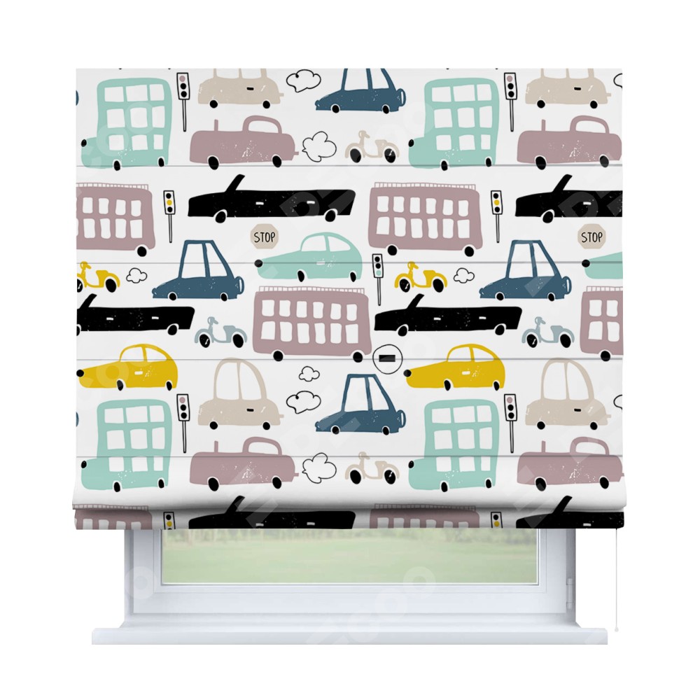 Римская штора производителя «Cortin», используется для проёма, пошита из ткани блэкаут с нанесением сублимационной печати «Красочный трафик». Имеет универсальный механизм и подходит для монтажа: на потолок, на стену и в нишу.
