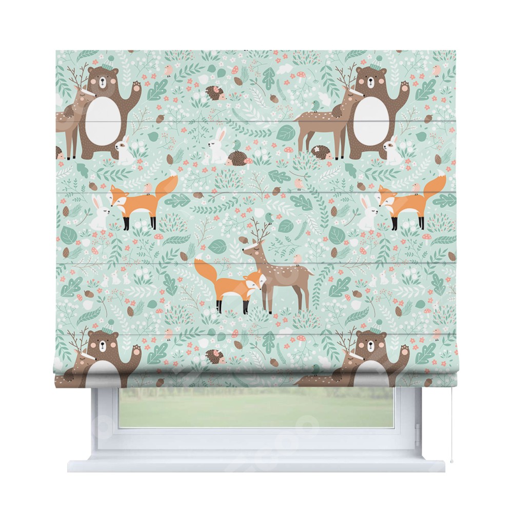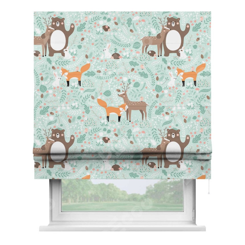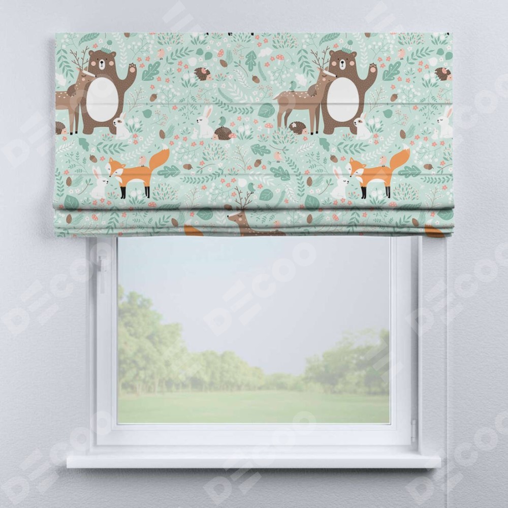 Римская штора производителя «Cortin», используется для проёма, пошита из ткани блэкаут с нанесением сублимационной печати «Лесные друзья». Имеет универсальный механизм и подходит для монтажа: на потолок, на стену и в нишу.
