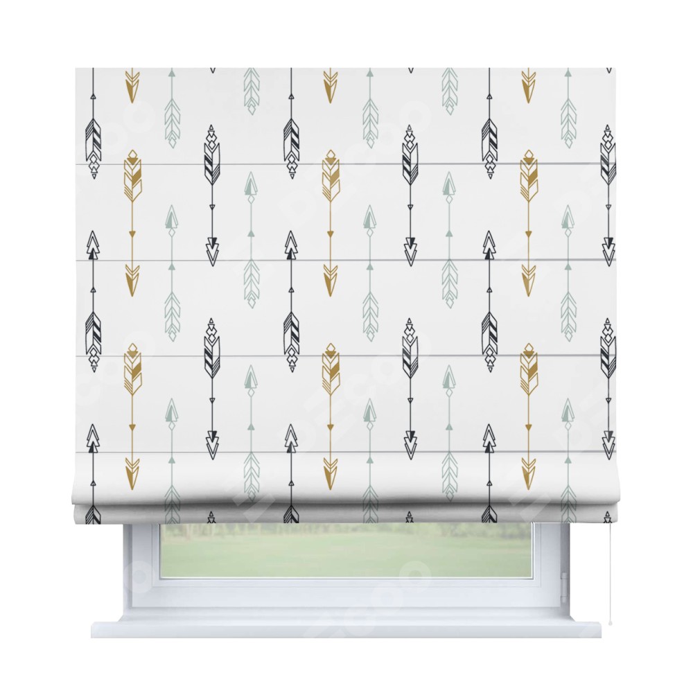 Римская штора производителя «Cortin», используется для проёма, пошита из ткани блэкаут с нанесением сублимационной печати «Любимые стрелки». Имеет универсальный механизм и подходит для монтажа: на потолок, на стену и в нишу.