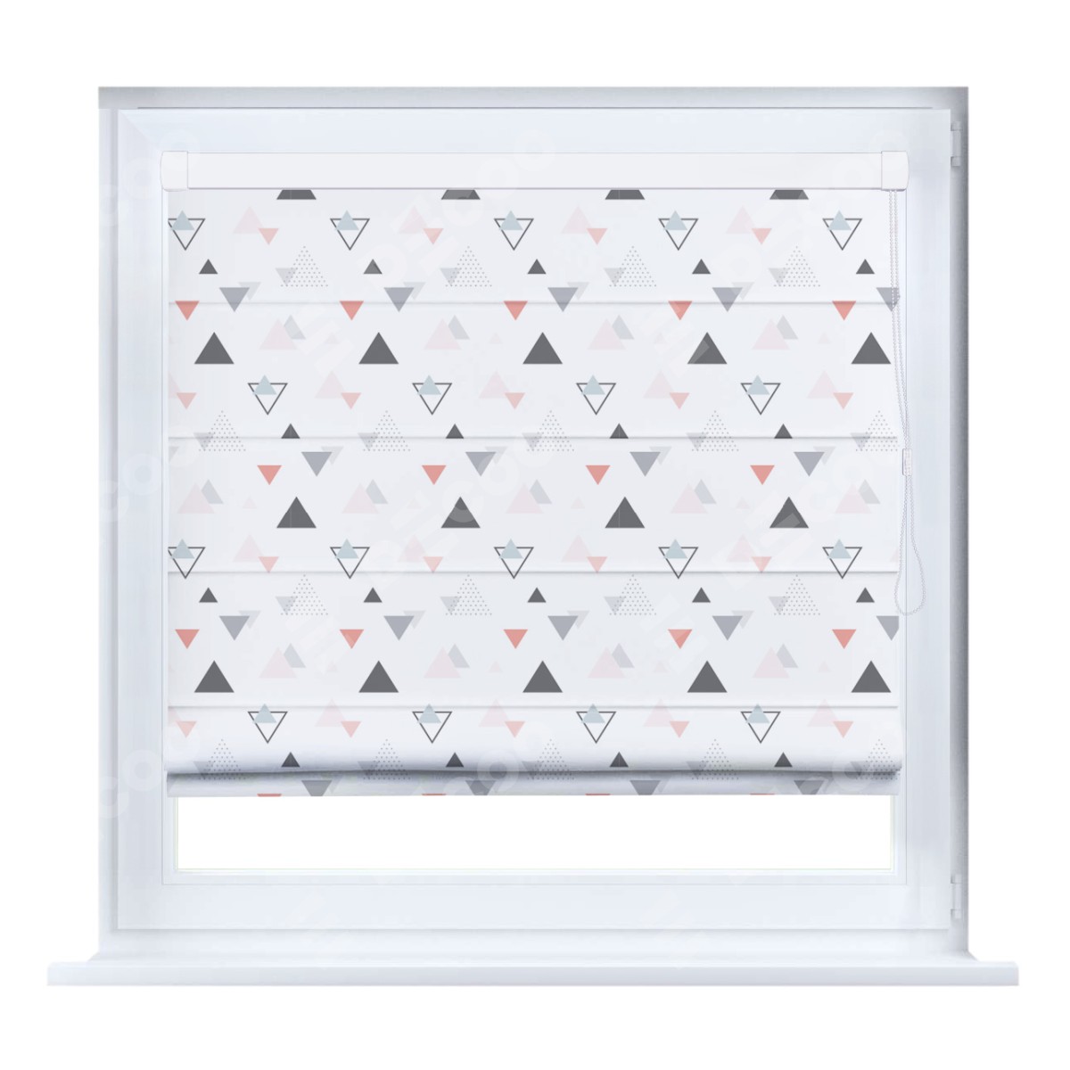 Римская штора кассетного типа, производителя «Cortin», устанавливается только на пластиковые окна и прилегает к стеклопакету, пошита из ткани блэкаут с нанесением сублимационной печати «Дождь из треугольников».