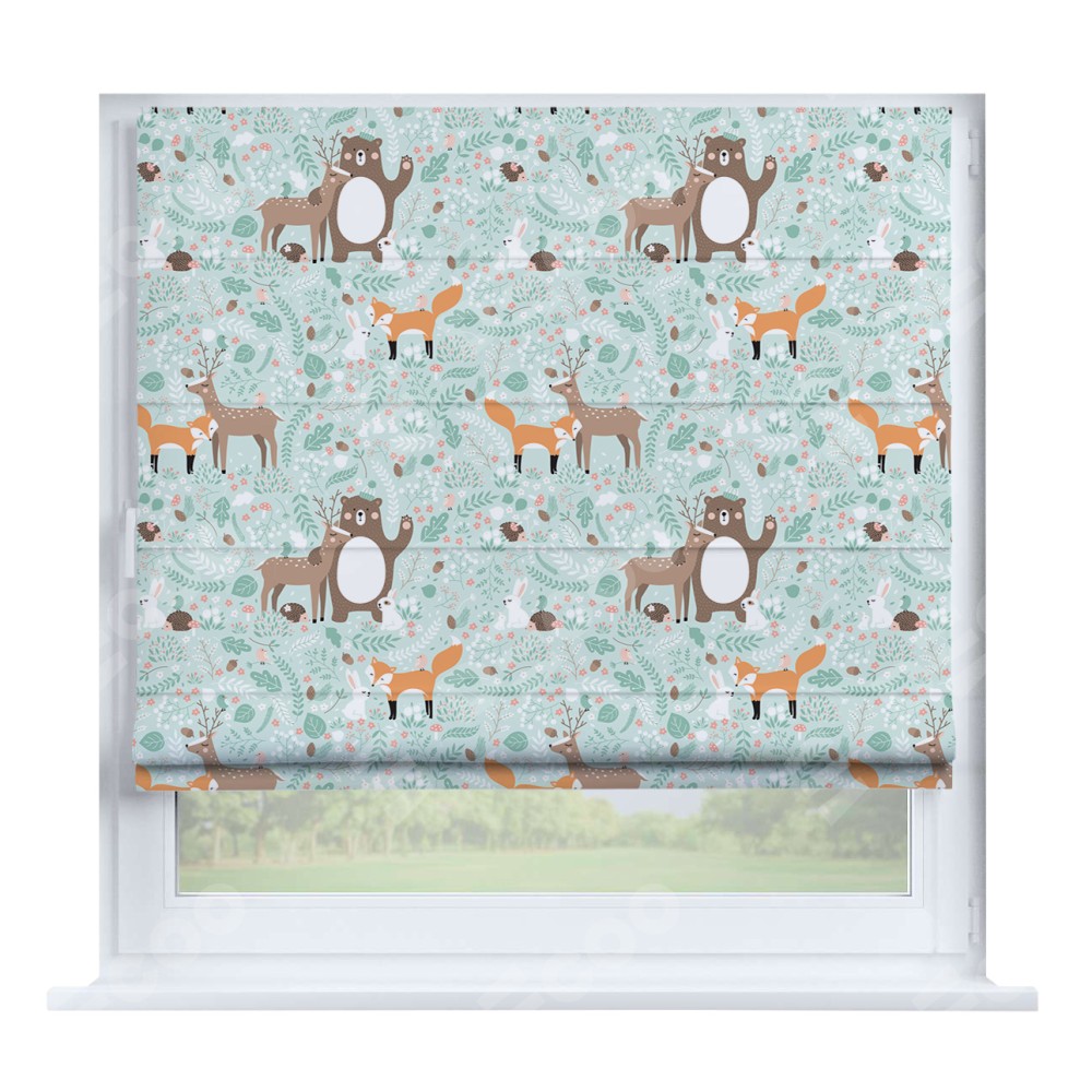 Римская штора производителя «Cortin», устанавливается на створку окна, пошита из ткани блэкаут с нанесением сублимационной печати «Лесные друзья». Штора шьётся по индивидуальным размерам, для данного типа римской шторы возможная ширина от 35 до 150 см., высота до 250 см.