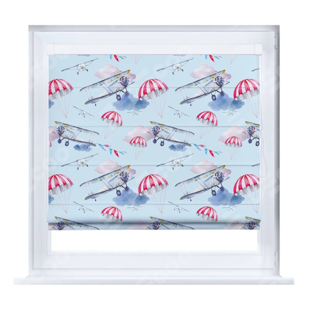 Римская штора производителя «Cortin», устанавливается на створку окна, пошита из ткани блэкаут с нанесением сублимационной печати «Самолёт». Штора шьётся по индивидуальным размерам, для данного типа римской шторы возможная ширина от 35 до 150 см., высота до 250 см.