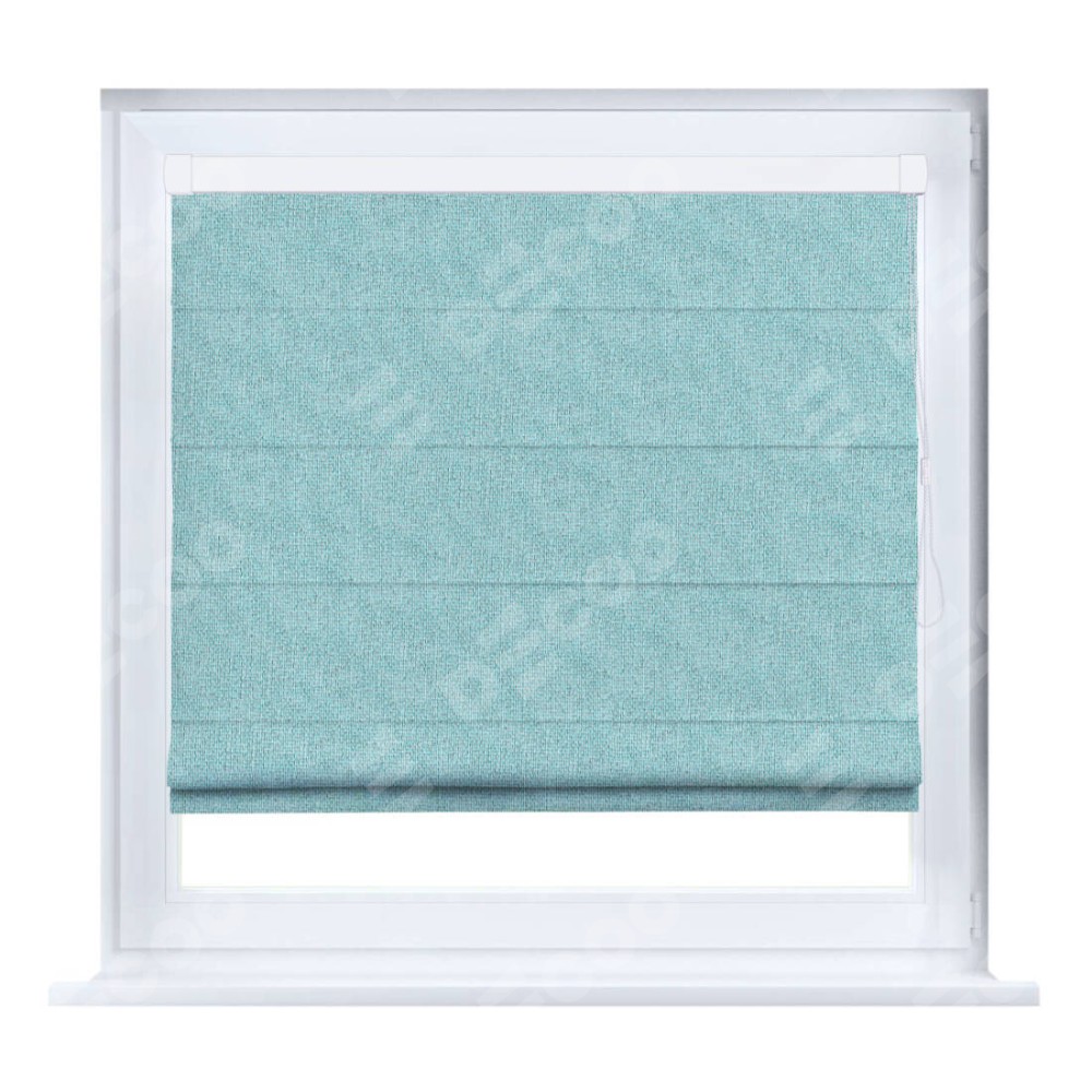 Римская штора производителя «Cortin», устанавливается на створку окна, пошита из ткани лён димаут бирюзовый, артикул 23. Штора шьётся по индивидуальным размерам, для данного типа римской шторы возможная ширина от 35 до 150 см., высота до 250 см.