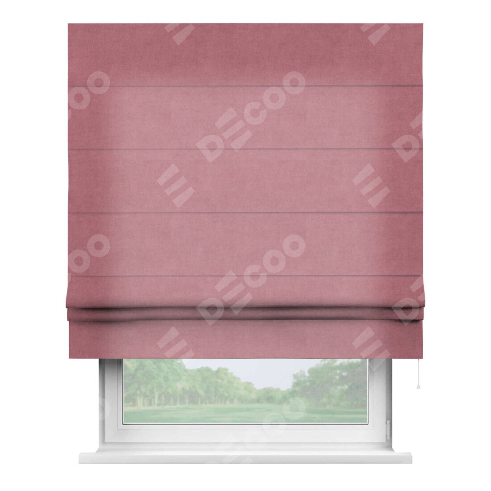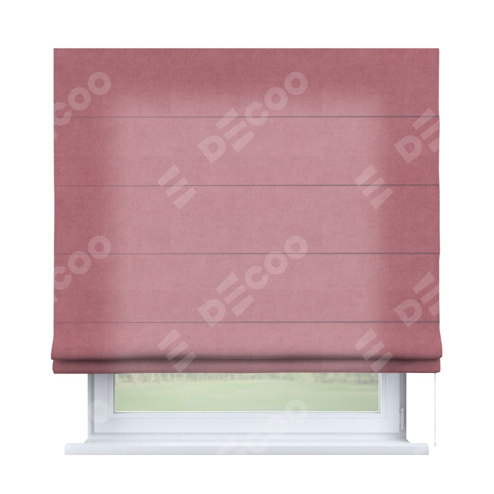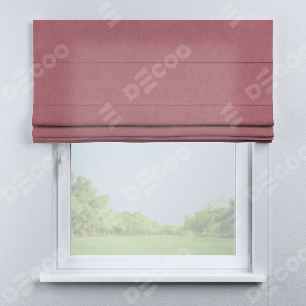 Римская штора производителя «Cortin», используется для проёма, пошита из ткани вельвет брусника, артикул ткани 85550. Имеет универсальный механизм и подходит для монтажа: на потолок, на стену и в нишу.