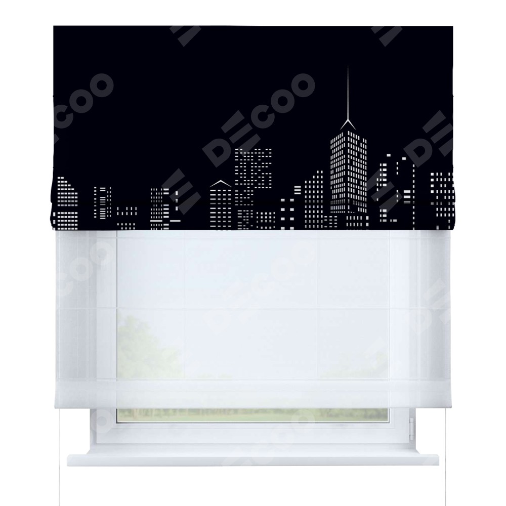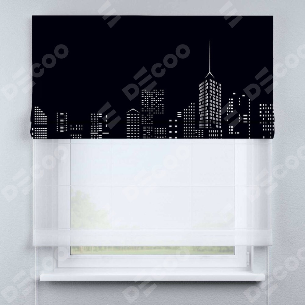 Римская штора день-ночь производителя «Cortin», используется для проёма, пошита из двух полотен, с лицевой блэкаут с нанесением сублимационной печати «Ночной город», вторая ткань тюль (по стандарту комплектуется тюль белого цвета артикул V-01). Имеет универсальный механизм и подходит для монтажа: на потолок, на стену и в нишу.