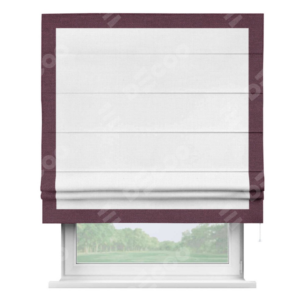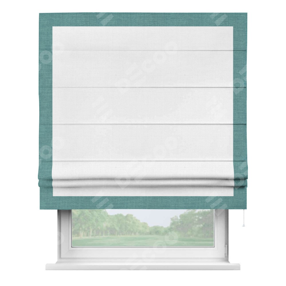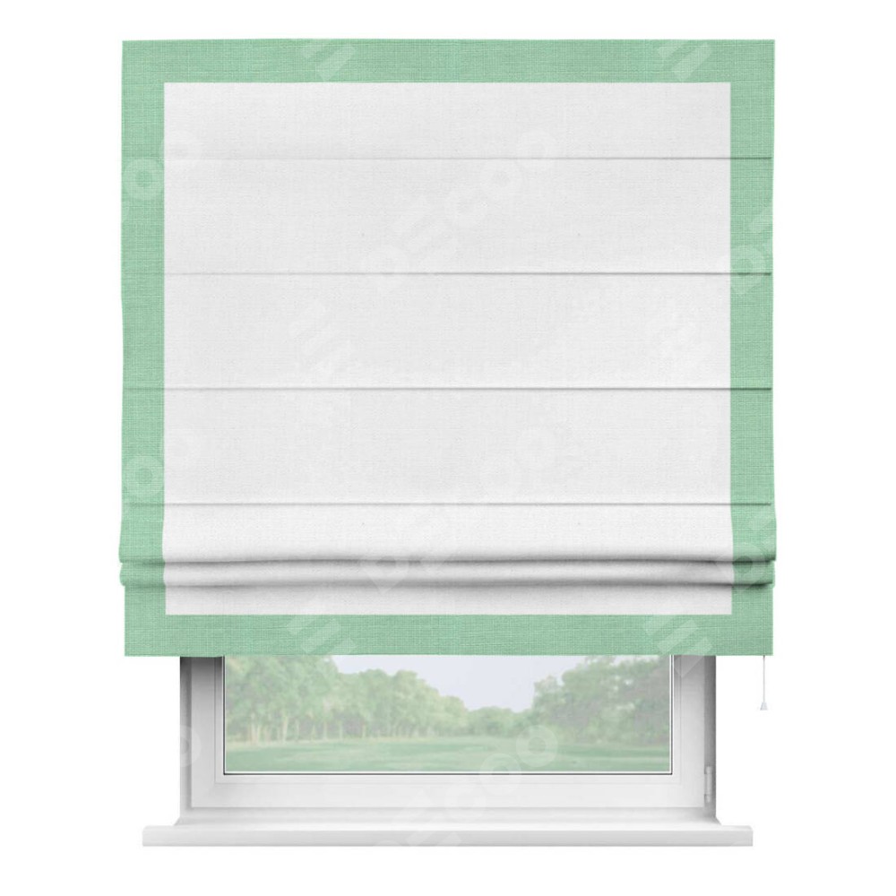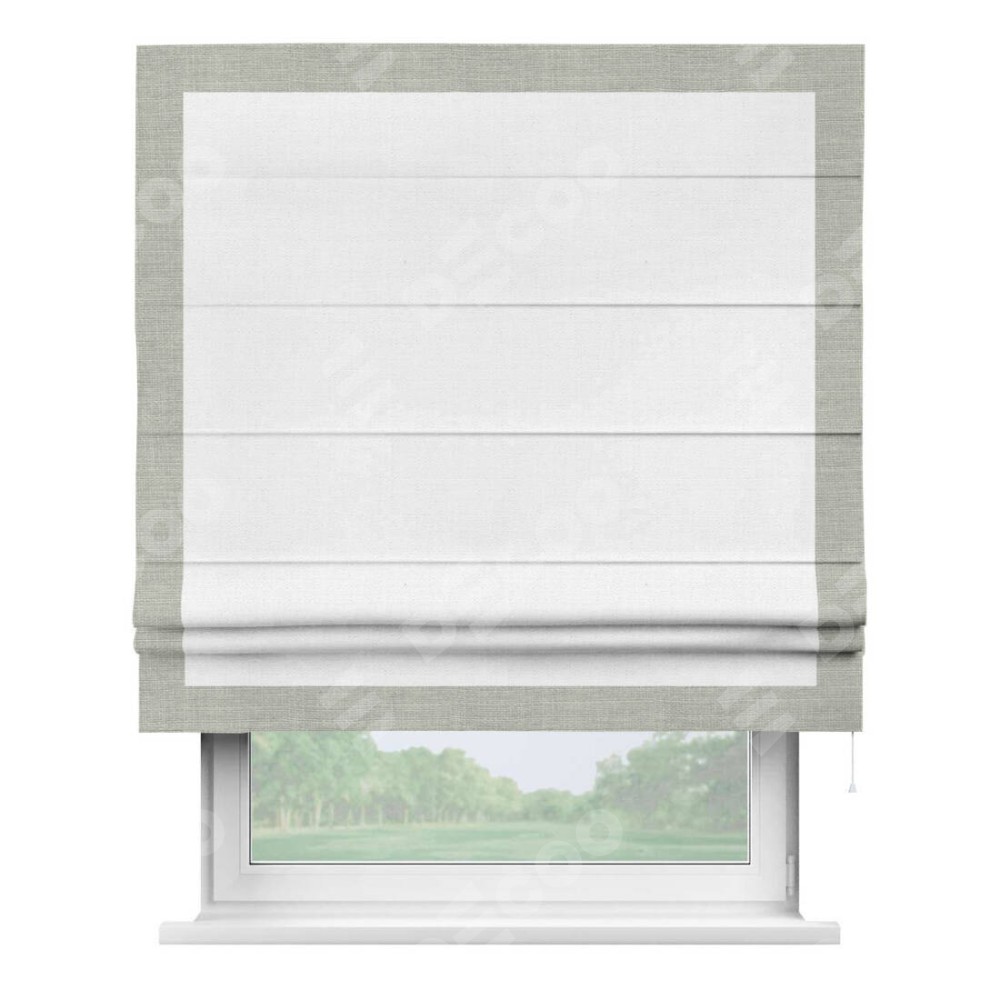 Римская штора производителя «Cortin», используется для проёма, пошита из ткани лён белый, артикул 53430. Отделка шторы кантом «Чесс», ткань для канта используется из льна разной расцветки на выбор. Имеет универсальный механизм и подходит для монтажа: на потолок, на стену и в нишу.