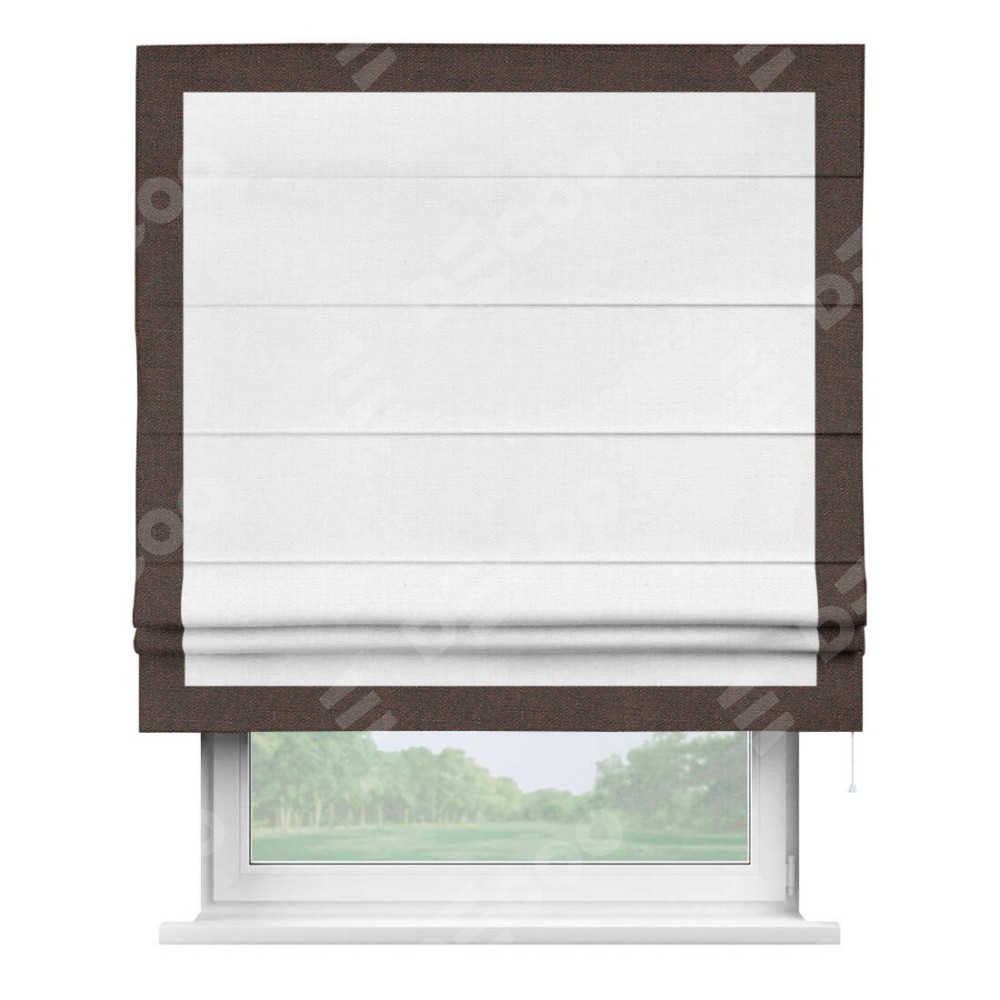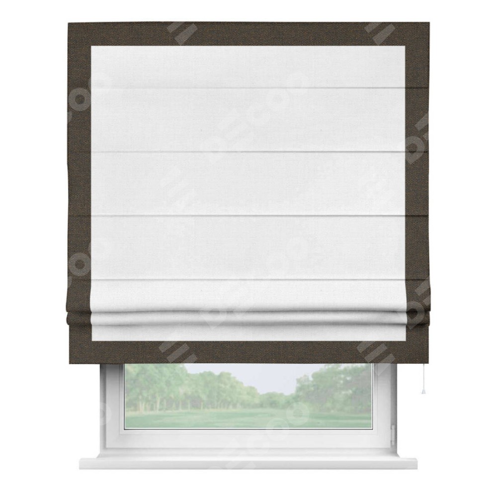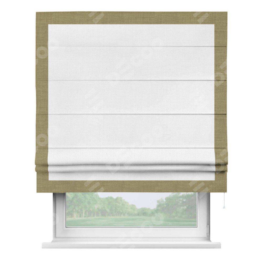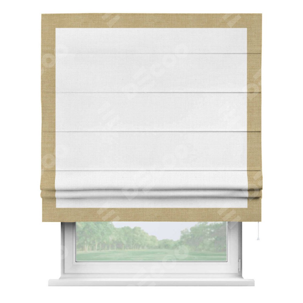 Римская штора производителя «Cortin», используется для проёма, пошита из ткани лён белый, артикул 53430. Отделка шторы кантом «Чесс», ткань для канта используется из льна разной расцветки на выбор. Имеет универсальный механизм и подходит для монтажа: на потолок, на стену и в нишу.