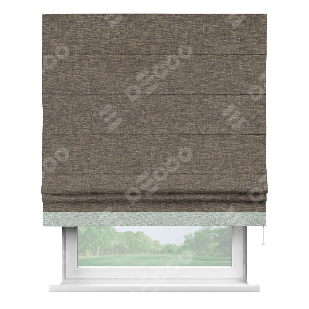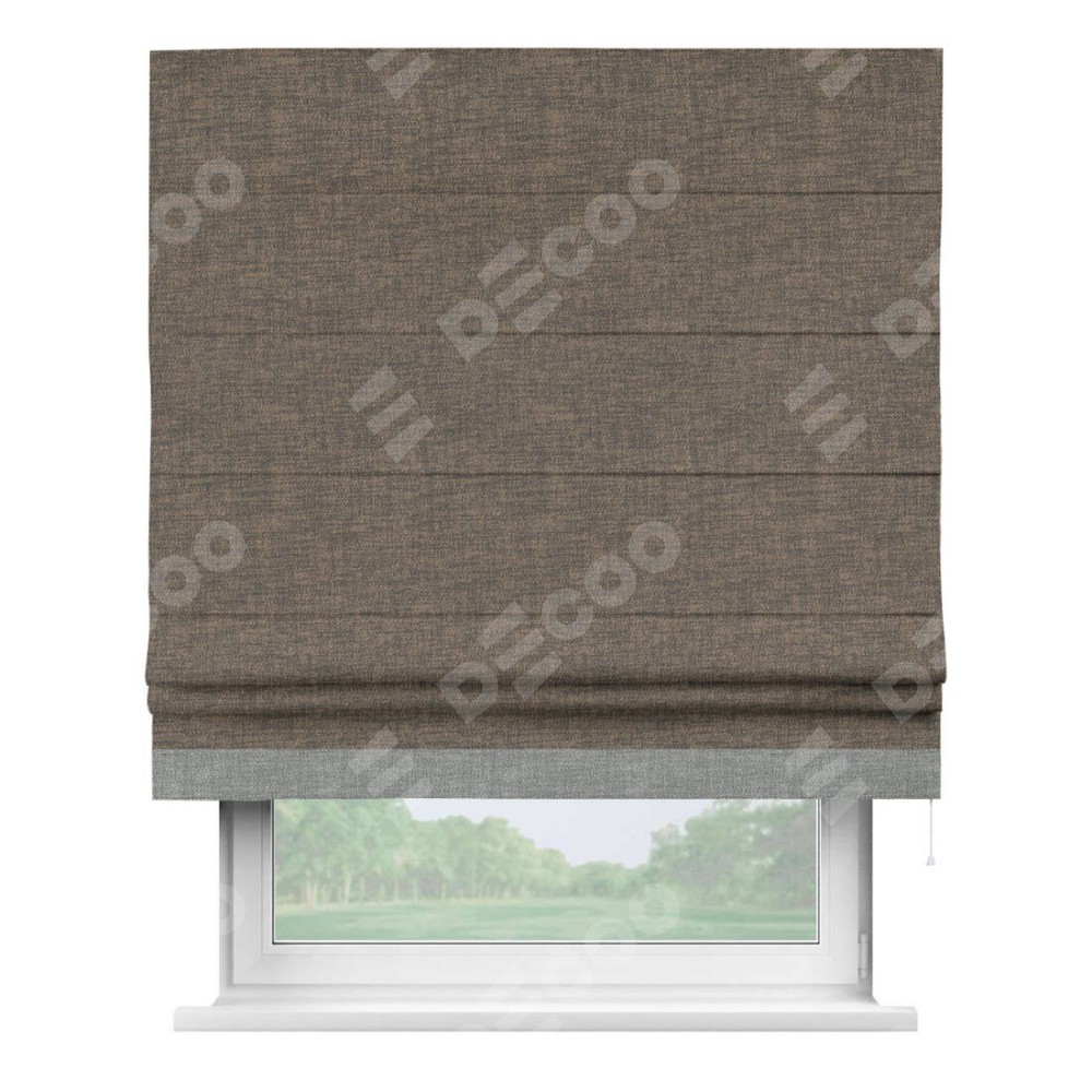 Римская штора производителя «Cortin», используется для проёма, пошита из ткани рогожка димаут коричневый, артикул 80420. Отделка шторы кантом «Джестер», ткань для канта используется из рогожки димаут разной расцветки на выбор. Имеет универсальный механизм и подходит для монтажа: на потолок, на стену и в нишу.