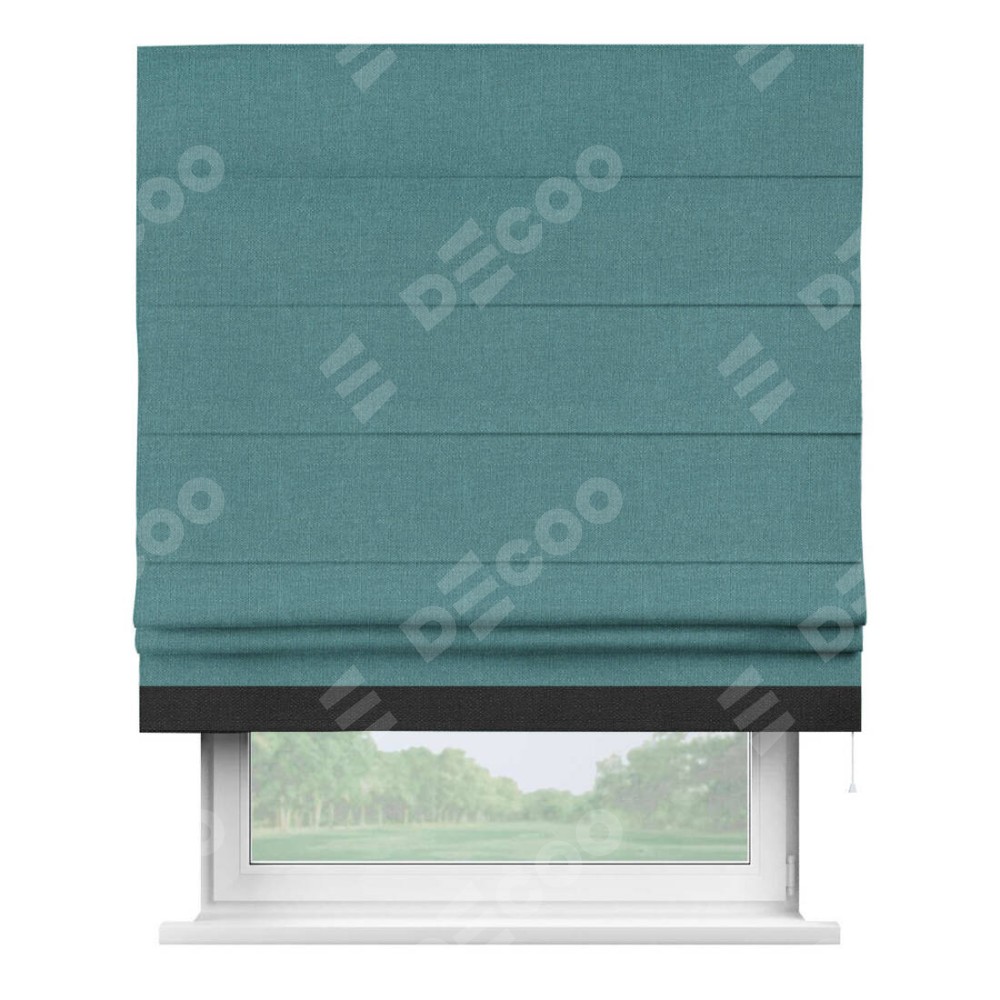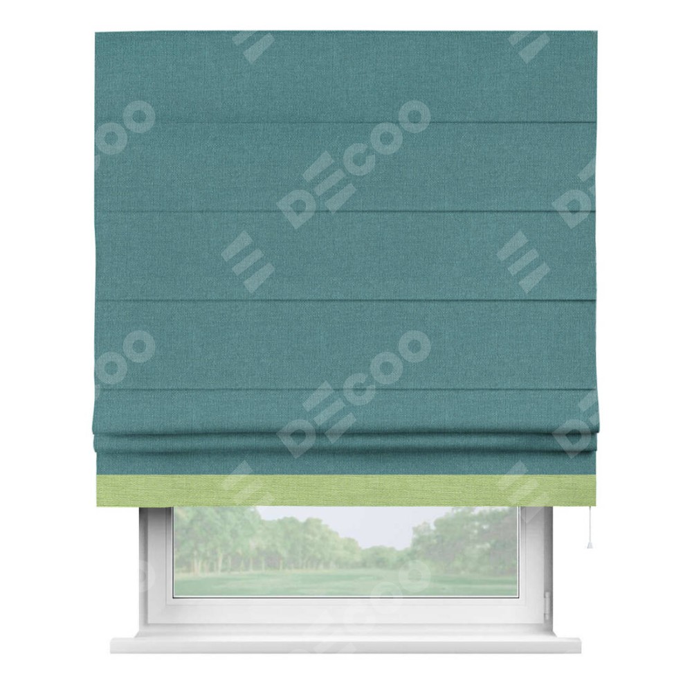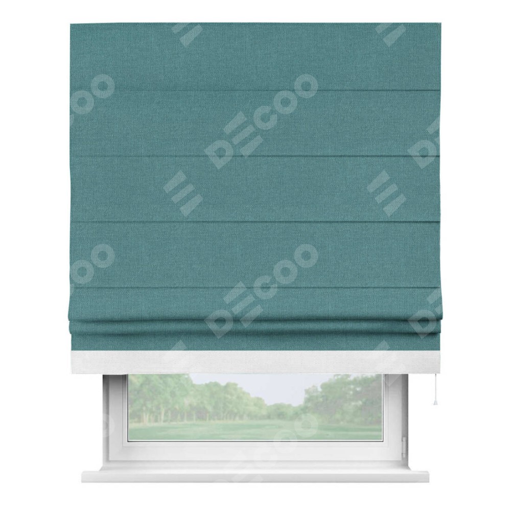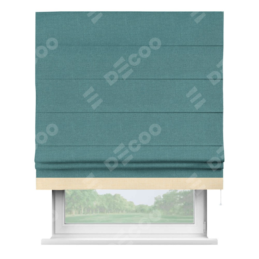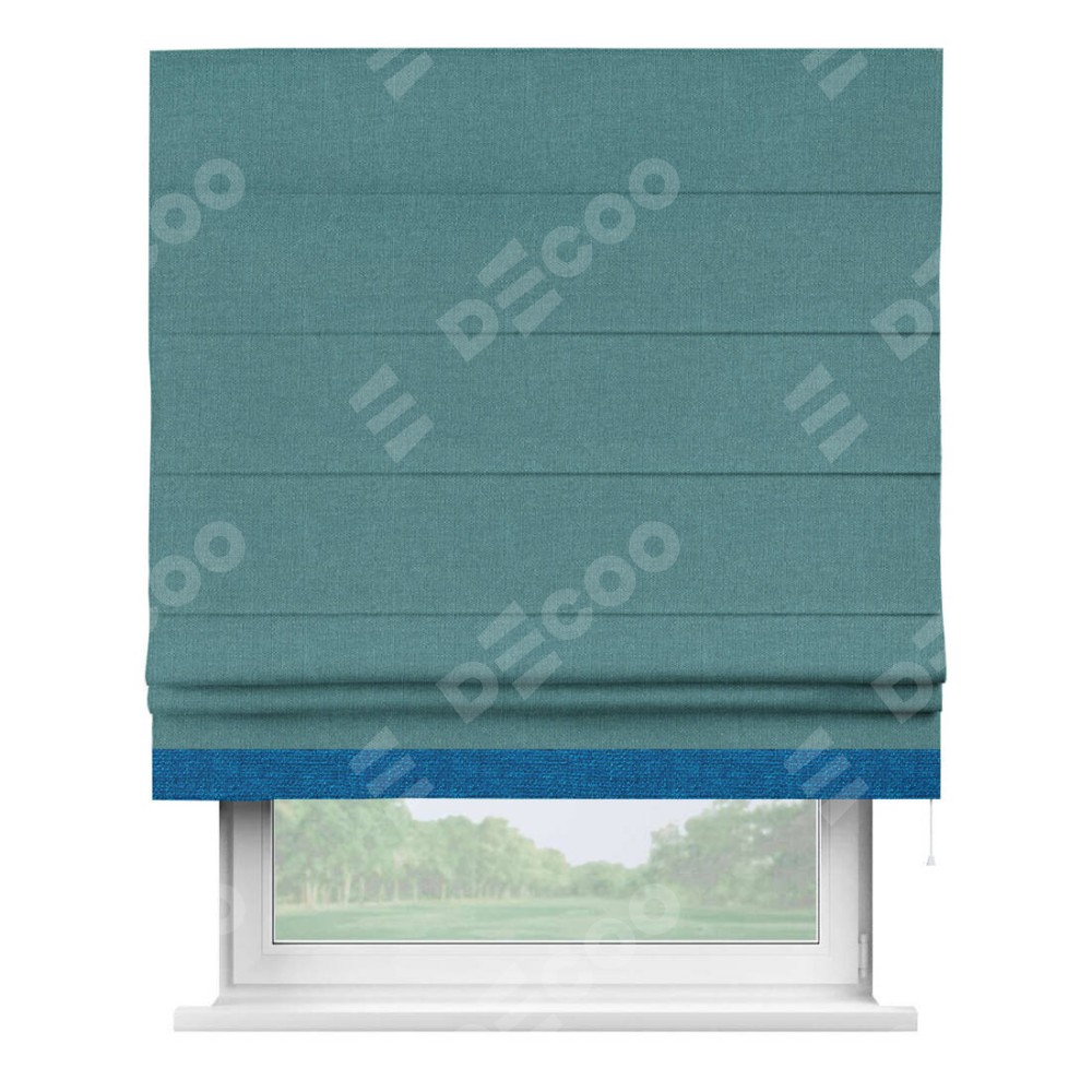 Римская штора производителя «Cortin», используется для проёма, пошита из ткани лён бирюзовый, артикул 53436. Отделка шторы кантом «Джестер», ткань для канта используется из льна разной расцветки на выбор. Имеет универсальный механизм и подходит для монтажа: на потолок, на стену и в нишу.