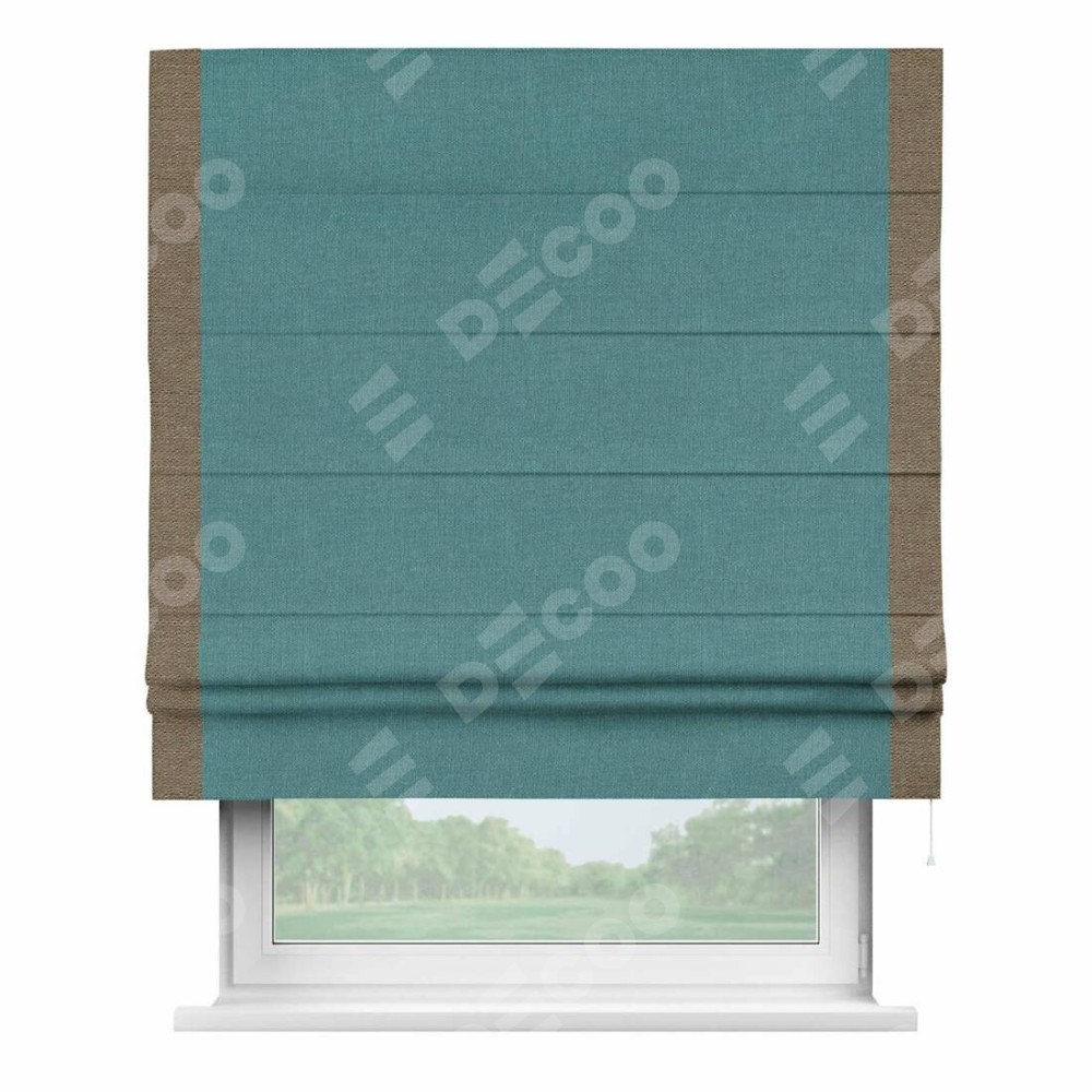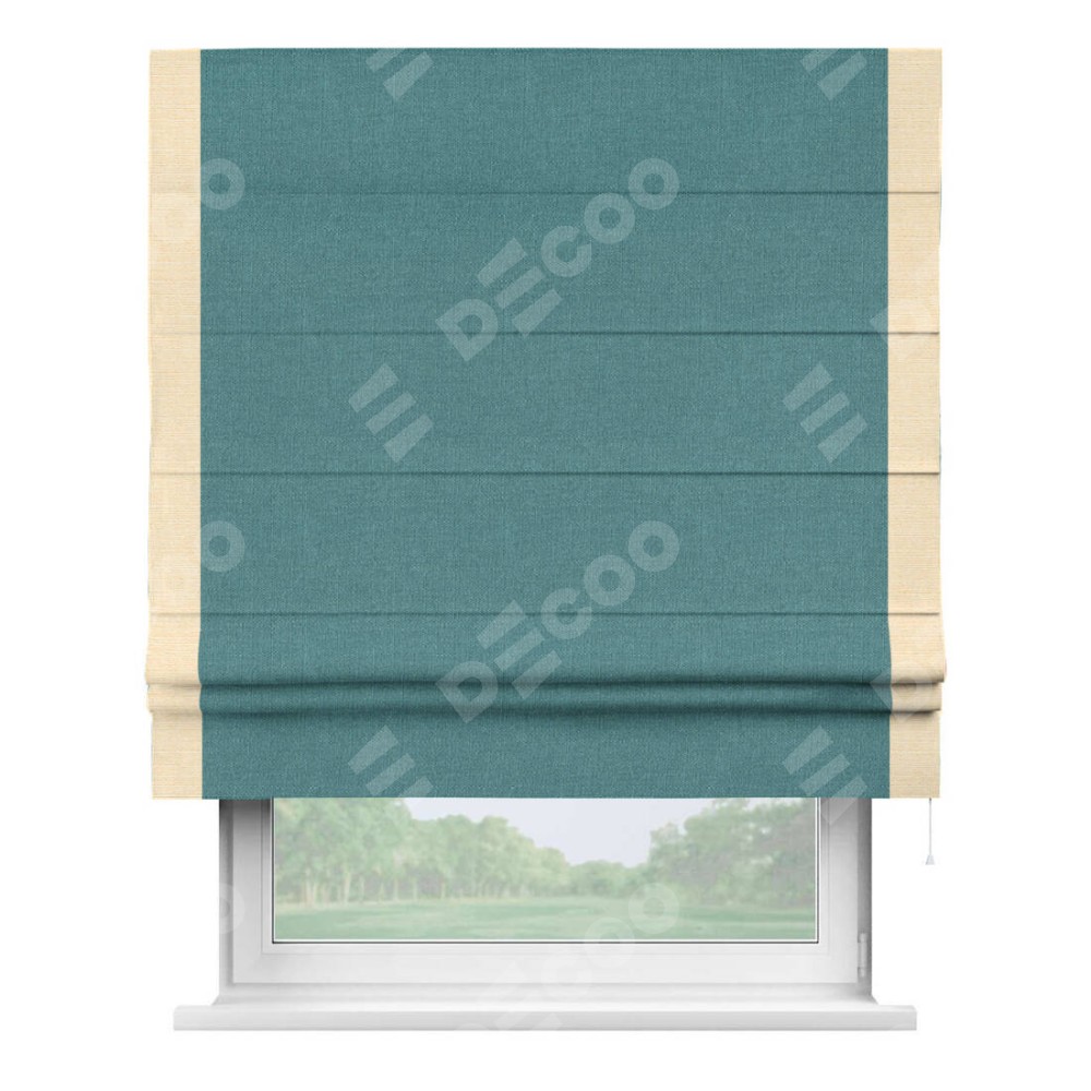 Римская штора производителя «Cortin», используется для проёма, пошита из ткани лён бирюзовый, артикул 53436. Отделка шторы кантом «Стрим Дуо», ткань для канта используется из льна разной расцветки на выбор. Имеет универсальный механизм и подходит для монтажа: на потолок, на стену и в нишу.