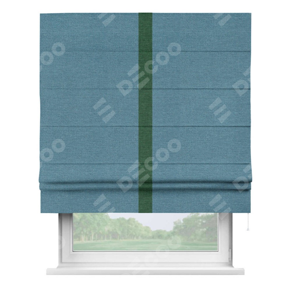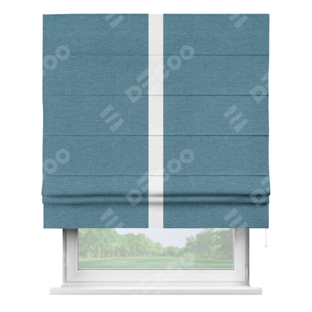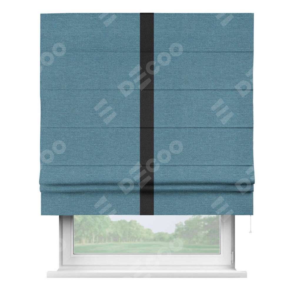 Римская штора производителя «Cortin», используется для проёма, пошита из ткани лён голубой, артикул 63741. Отделка шторы кантом «Хайвэй», ткань для канта используется из льна разной расцветки на выбор. Имеет универсальный механизм и подходит для монтажа: на потолок, на стену и в нишу.