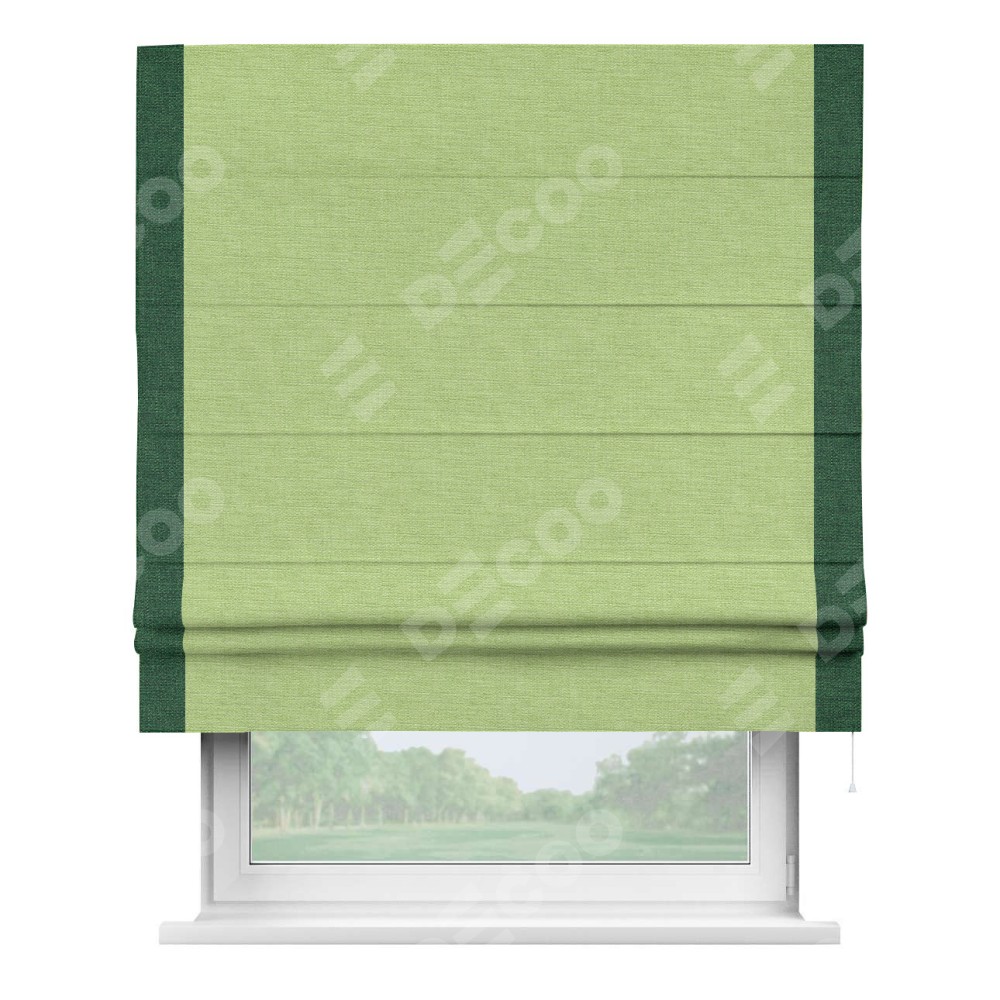 Римская штора производителя «Cortin», используется для проёма, пошита из ткани лён зеленый, артикул 85906. Отделка шторы кантом «Стрим Дуо», ткань для канта используется из льна разной расцветки на выбор. Имеет универсальный механизм и подходит для монтажа: на потолок, на стену и в нишу.