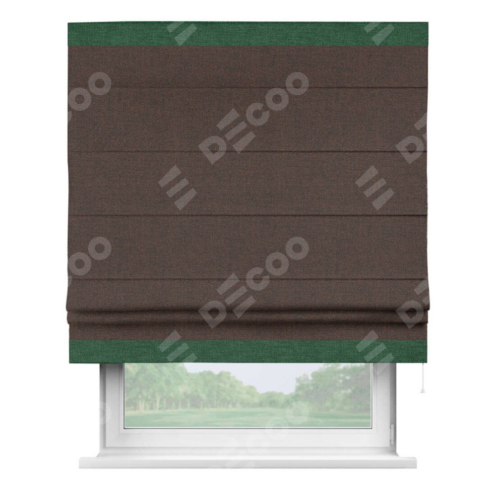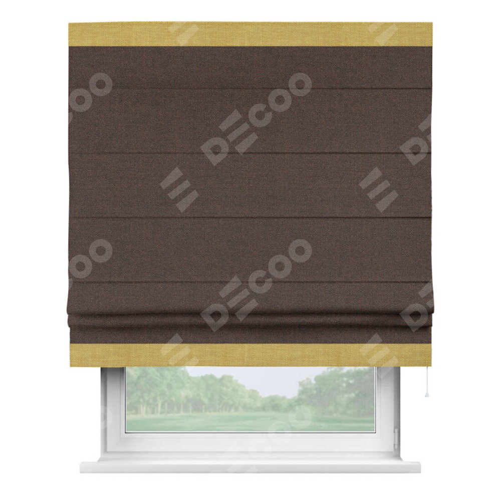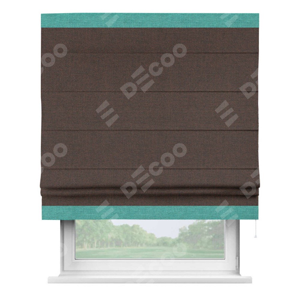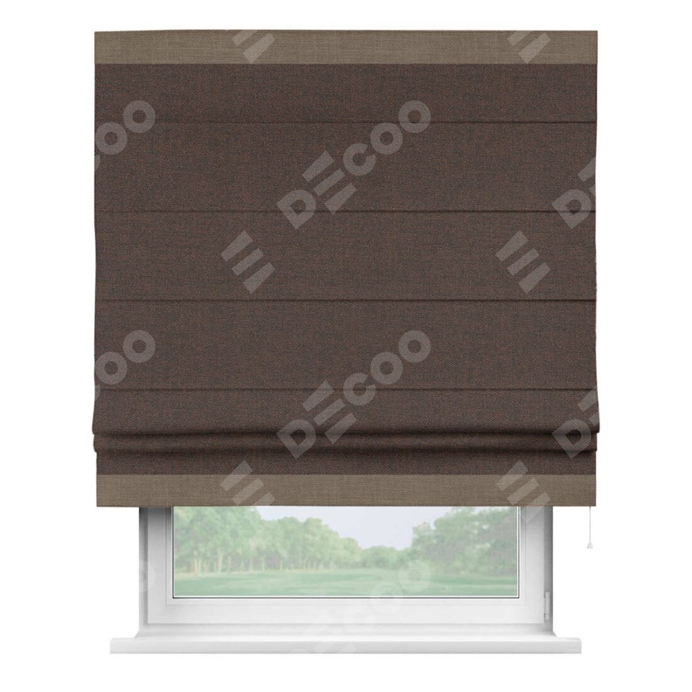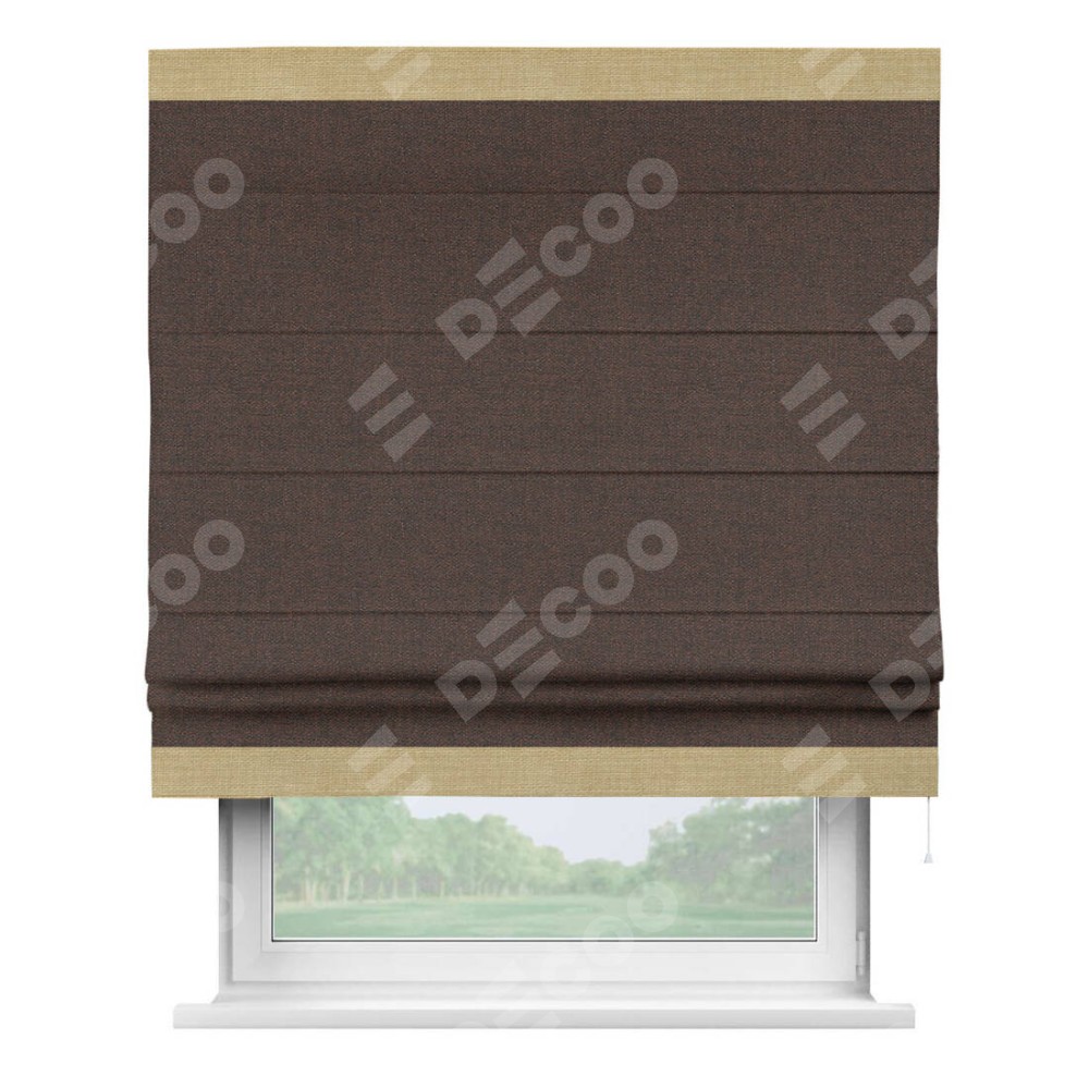 Римская штора производителя «Cortin», используется для проёма, пошита из ткани лён коричневый, артикул 53443. Отделка шторы кантом «Горизонт», ткань для канта используется из льна разной расцветки на выбор. Имеет универсальный механизм и подходит для монтажа: на потолок, на стену и в нишу.