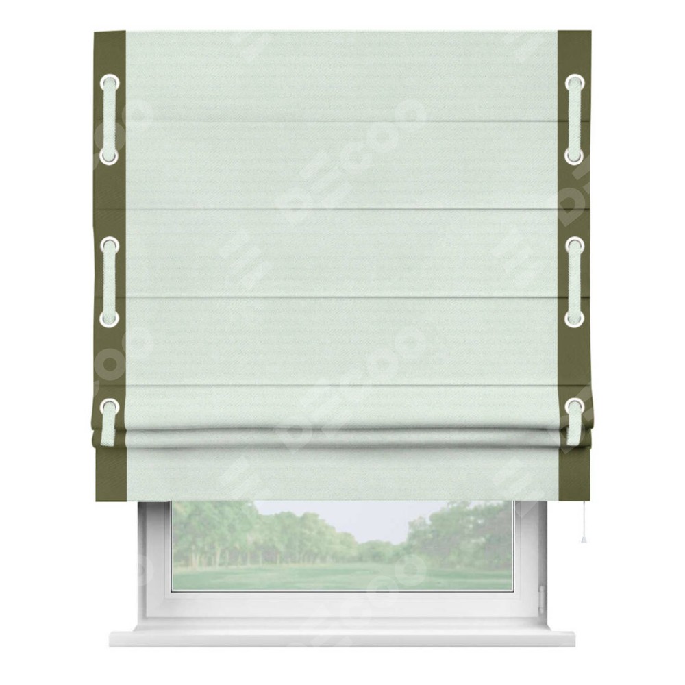 Римская штора производителя «Cortin», используется для проёма, пошита из ткани блэкаут однотонный дымчато-молочный, артикул ткани 88282. Отделка шторы кантом «Стрим Дуо» на кантах расположены люверсы с пояском, ткань для канта используется из блэкаута однотонного разной расцветки на выбор. Ткань для пояска обычно используется из основной ткани шторы, а так же можно сделать из любой расцветки по желанию. Имеет универсальный механизм и подходит для монтажа: на потолок, на стену и в нишу.