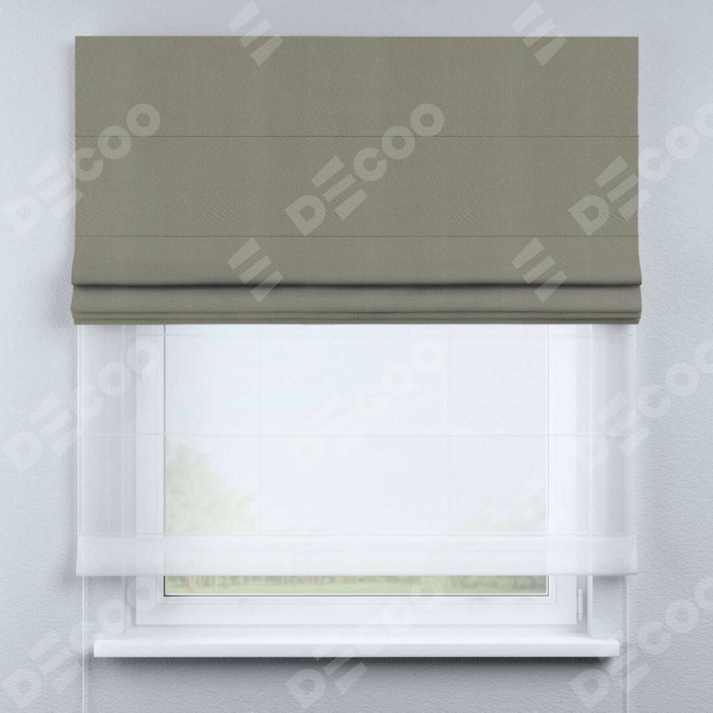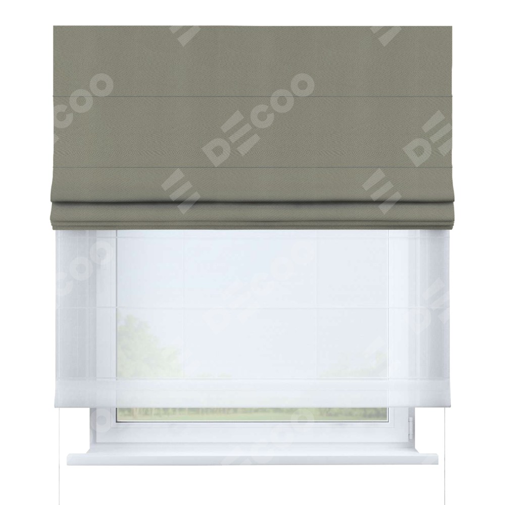 Римская штора день-ночь производителя «Cortin», используется для проёма, пошита из двух полотен, с лицевой стороны блэкаут однотонный серо-зелёный артикул 29568, вторая ткань тюль (по стандарту комплектуется тюль белого цвета артикул V-01). Имеет универсальный механизм и подходит для монтажа: на потолок, на стену и в нишу.