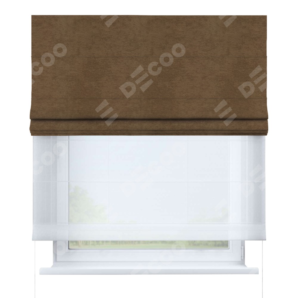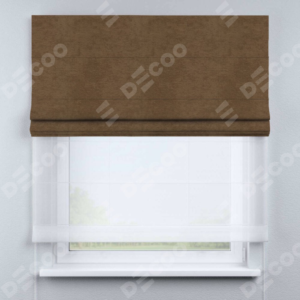 Римская штора день-ночь производителя «Cortin», используется для проёма, пошита из двух полотен, с лицевой стороны софт однотонный бронзовый артикул 33099, вторая ткань тюль (по стандарту комплектуется тюль белого цвета артикул V-01). Имеет универсальный механизм и подходит для монтажа: на потолок, на стену и в нишу.