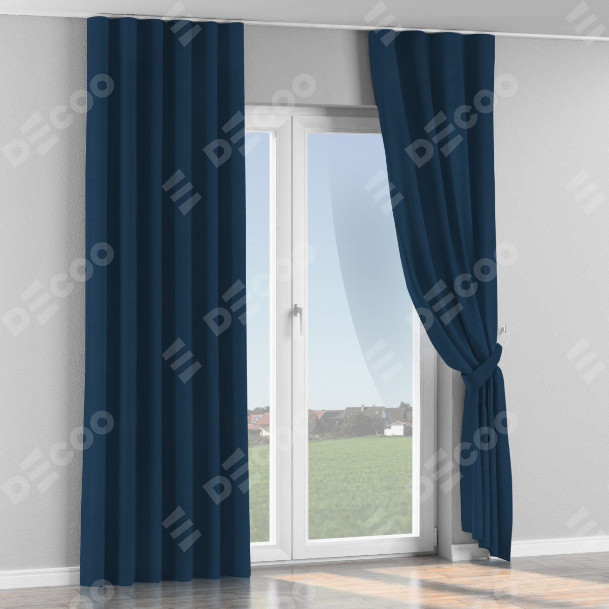 Комплект прямых штор, от производителя «Cortin», пошиты из ткани блэкаут однотонный синий, артикул ткани 29327. С изнаночной стороны в верхней части штор пристрачивается шторная лента с декоративными складками «Волна». Для создания элегантных складок прямые шторы шьются по стандарту с коэффициентом 1:2 (на 100 см. ширины проёма 200 см. ширины ткани).