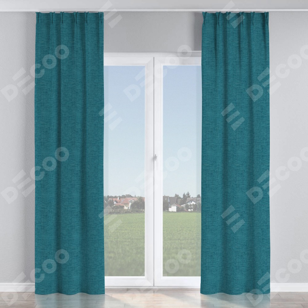 Комплект прямых штор, от производителя «Cortin», пошиты из ткани рогожка димаут синий, артикул ткани 80422. С изнаночной стороны в верхней части штор пристрачивается шторная лента с декоративными складками «Кустик». Для создания элегантных складок прямые шторы шьются по стандарту с коэффициентом 1:2 (на 100 см. ширины проёма 200 см. ширины ткани).