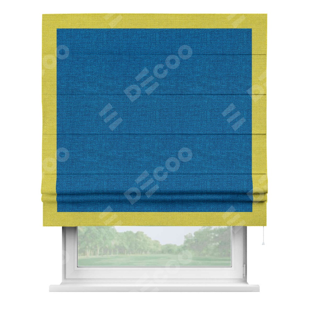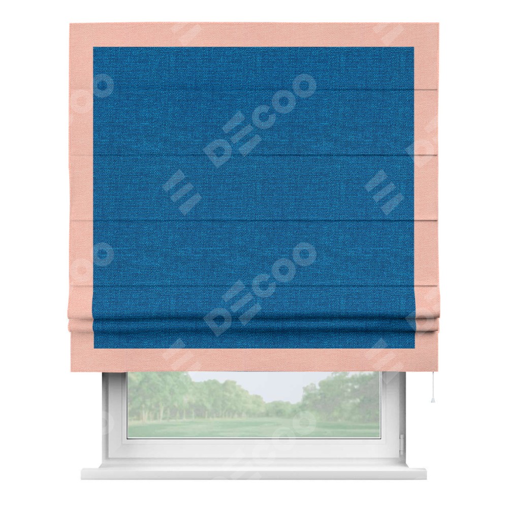 Римская штора производителя «Cortin», используется для проёма, пошита из ткани лён синий, артикул 63742. Отделка шторы кантом «Чесс», ткань для канта используется из льна разной расцветки на выбор. Имеет универсальный механизм и подходит для монтажа: на потолок, на стену и в нишу.