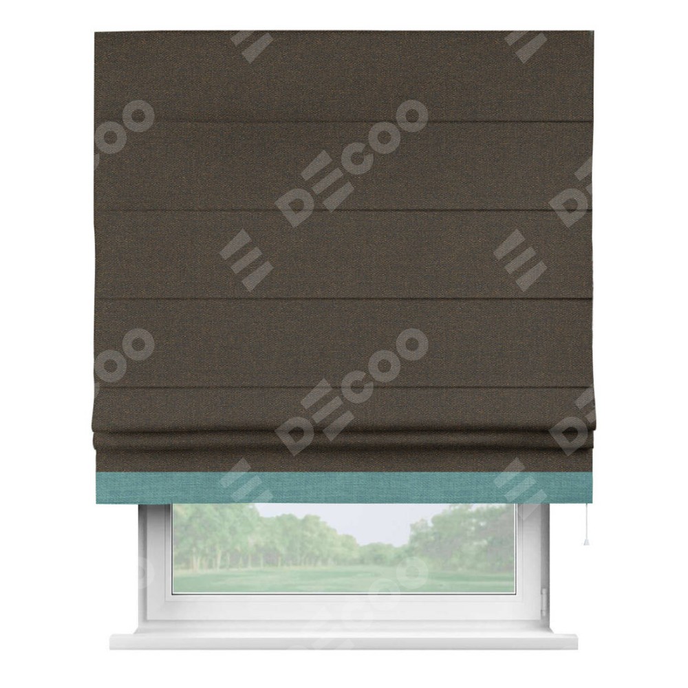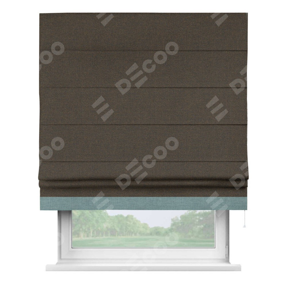 Римская штора производителя «Cortin», используется для проёма, пошита из ткани лён темно-коричневый, артикул 53444. Отделка шторы кантом «Джестер», ткань для канта используется из льна разной расцветки на выбор. Имеет универсальный механизм и подходит для монтажа: на потолок, на стену и в нишу.