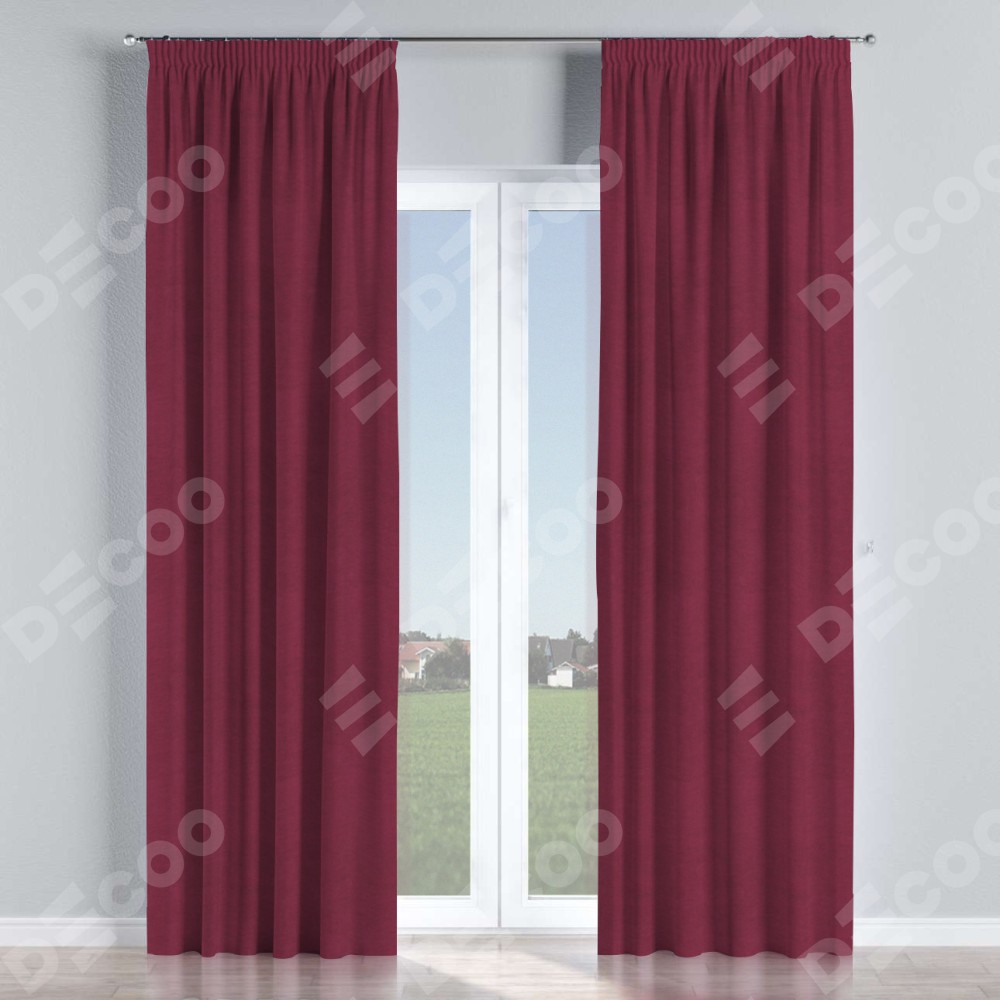 Комплект прямых штор, от производителя «Cortin», пошиты из ткани вельвет бордовый, артикул ткани 85553. С изнаночной стороны в верхней части штор пристрачивается шторная лента с декоративными складками «Карандаш». Для создания элегантных складок прямые шторы шьются по стандарту с коэффициентом 1:2 (на 100 см. ширины проёма 200 см. ширины ткани).