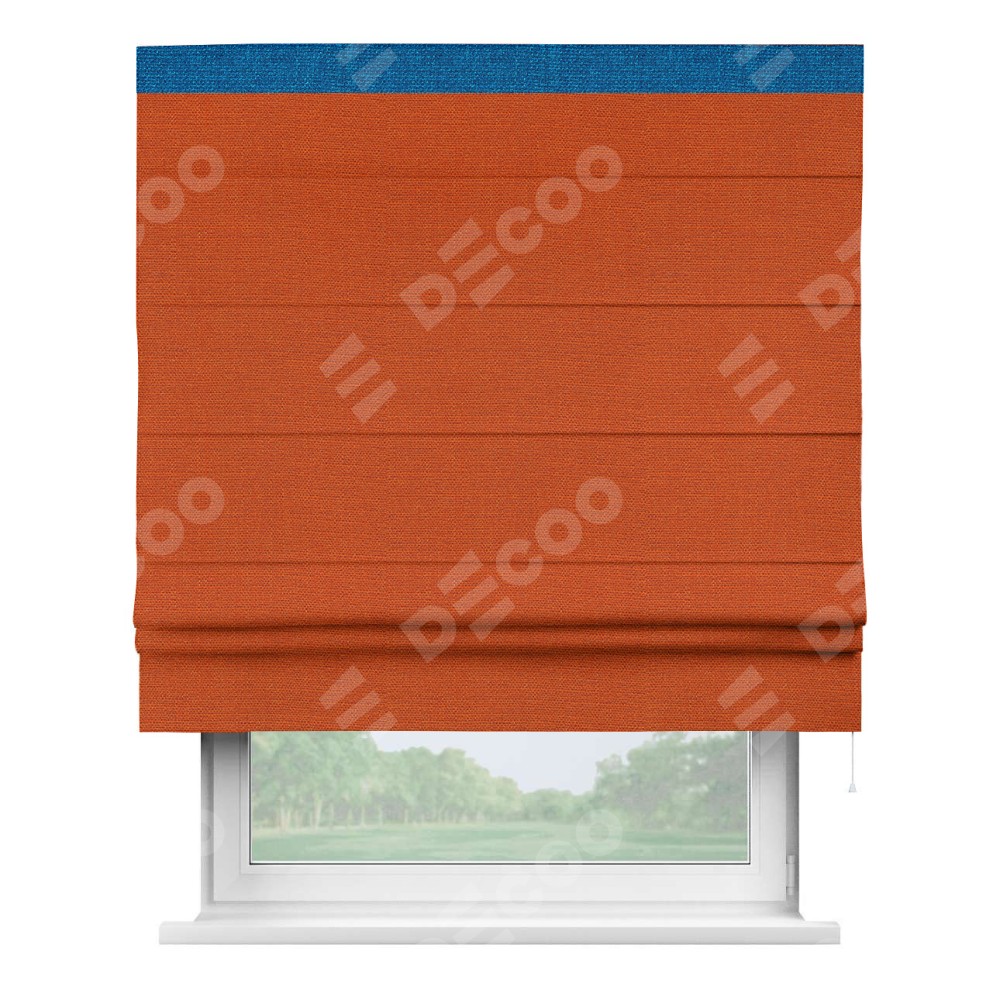 Римская штора производителя «Cortin», используется для проёма, пошита из ткани лён терракотовый, артикул 53440. Отделка шторы кантом «Кинг», ткань для канта используется из льна разной расцветки на выбор. Имеет универсальный механизм и подходит для монтажа: на потолок, на стену и в нишу.