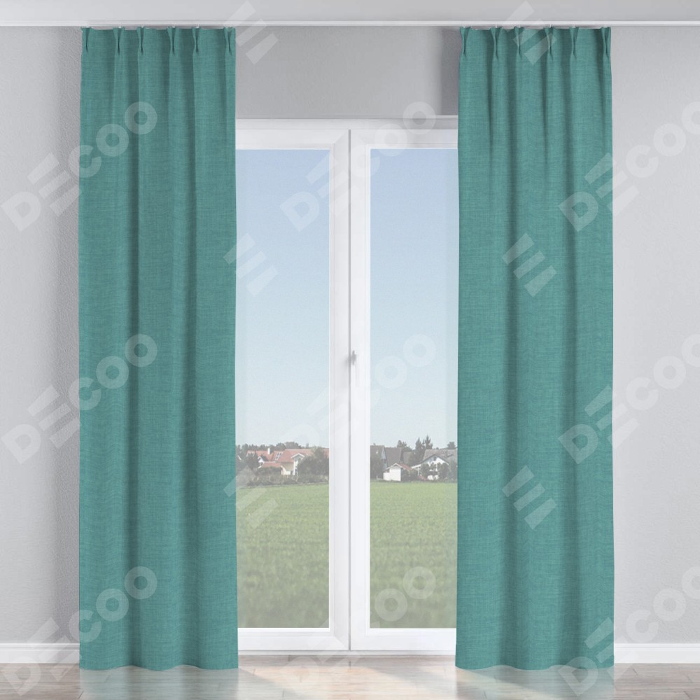 Комплект прямых штор, от производителя «Cortin», пошиты из ткани лён бирюза, артикул ткани 7446. С изнаночной стороны в верхней части штор пристрачивается шторная лента с декоративными складками «Кустик». Для создания элегантных складок прямые шторы шьются по стандарту с коэффициентом 1:2 (на 100 см. ширины проёма 200 см. ширины ткани).