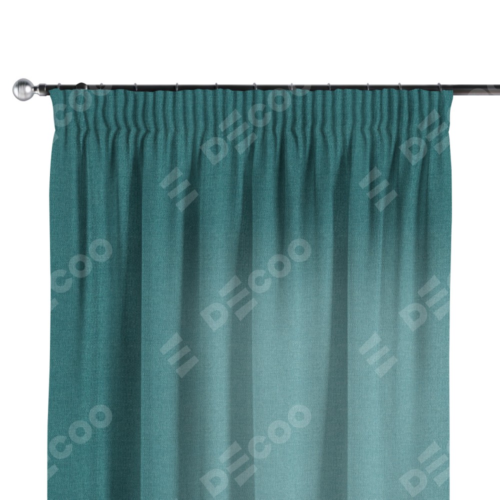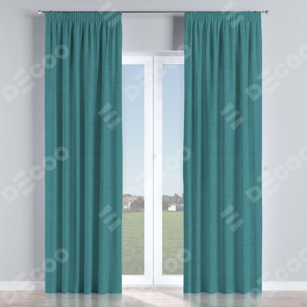 Комплект прямых штор, от производителя «Cortin», пошиты из ткани лён бирюзовый, артикул ткани 53436. С изнаночной стороны в верхней части штор пристрачивается шторная лента с декоративными складками «Карандаш». Для создания элегантных складок прямые шторы шьются по стандарту с коэффициентом 1:2 (на 100 см. ширины проёма 200 см. ширины ткани).