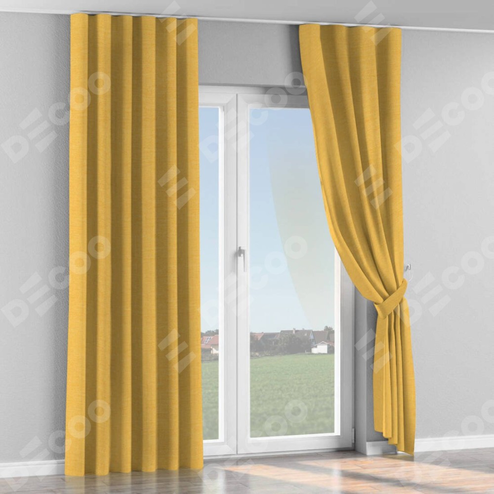Комплект прямых штор, от производителя «Cortin», пошиты из ткани лён желтый, артикул ткани 63738. С изнаночной стороны в верхней части штор пристрачивается шторная лента с декоративными складками «Волна». Для создания элегантных складок прямые шторы шьются по стандарту с коэффициентом 1:2 (на 100 см. ширины проёма 200 см. ширины ткани).