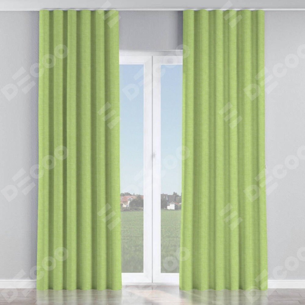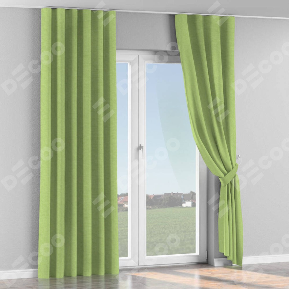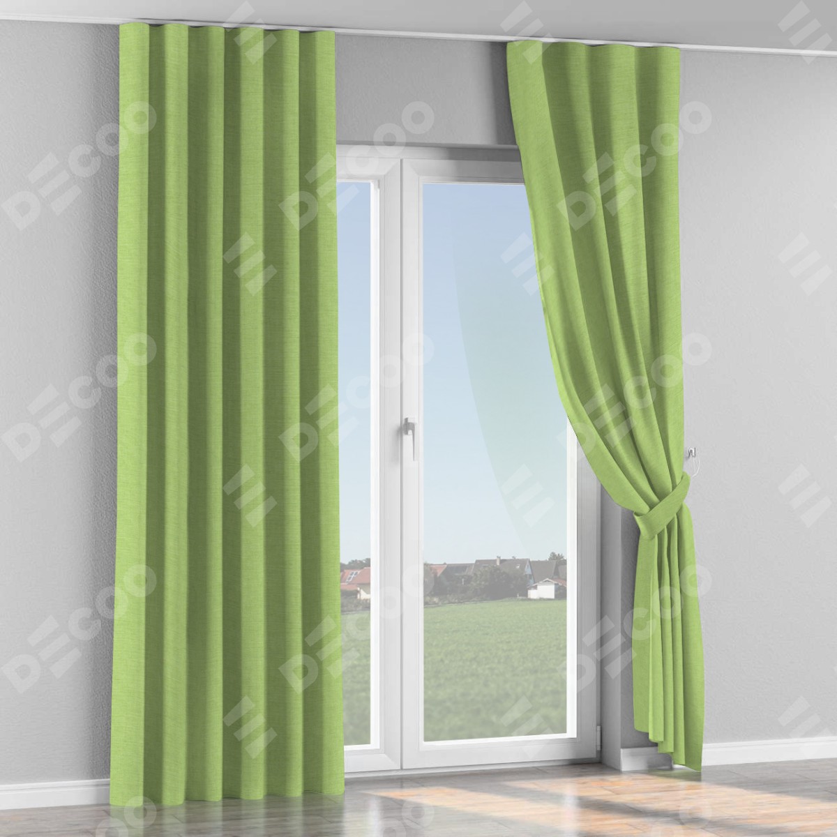 Комплект прямых штор, от производителя «Cortin», пошиты из ткани лён зелёный, артикул ткани 85906. С изнаночной стороны в верхней части штор пристрачивается шторная лента с декоративными складками «Волна». Для создания элегантных складок прямые шторы шьются по стандарту с коэффициентом 1:2 (на 100 см. ширины проёма 200 см. ширины ткани).