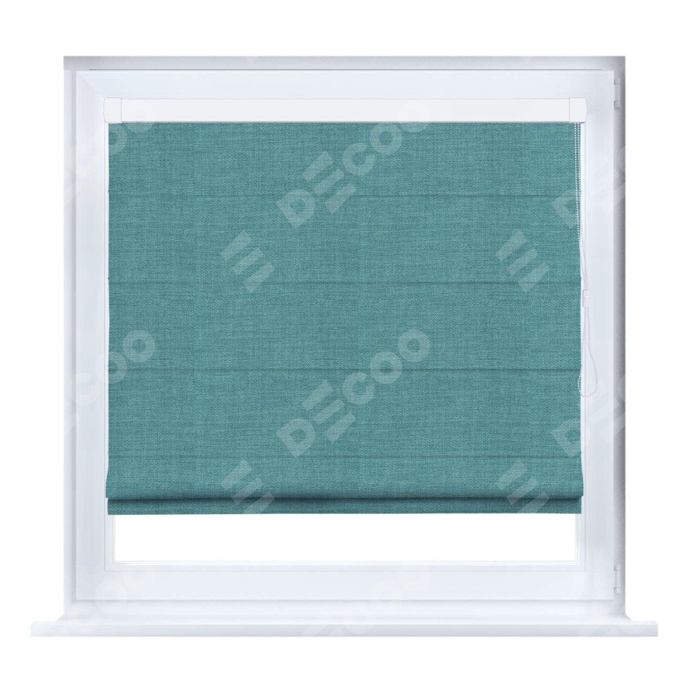 Римская штора кассетного типа, производителя «Cortin», устанавливается только на пластиковые окна и прилегает к стеклопакету, пошита из ткани лён бирюза, артикул 7446.