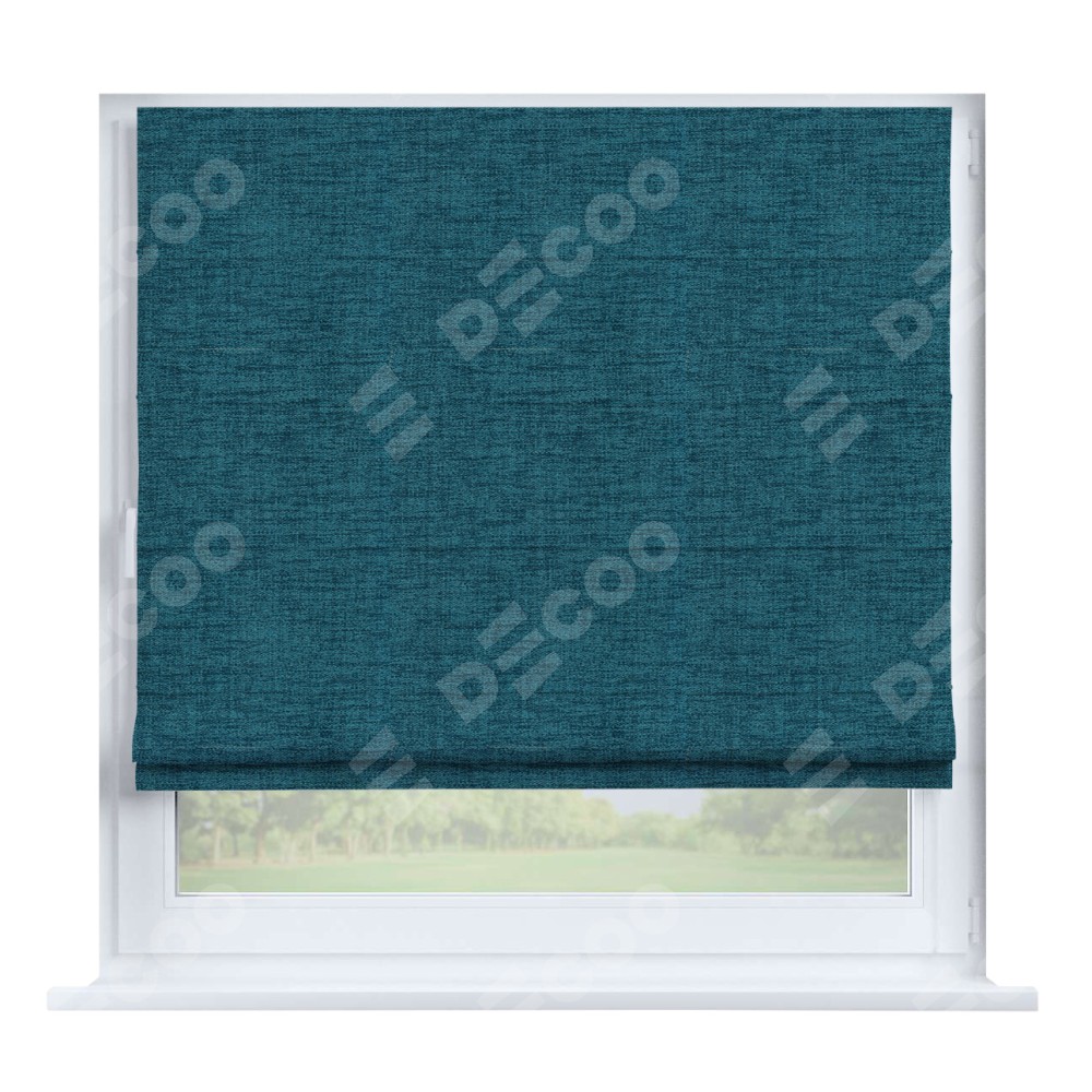 Римская штора производителя «Cortin», устанавливается на створку окна, пошита из ткани рогожка димаут синий, артикул 80422. Штора шьётся по индивидуальным размерам, для данного типа римской шторы возможная ширина от 35 до 150 см., высота до 250 см.