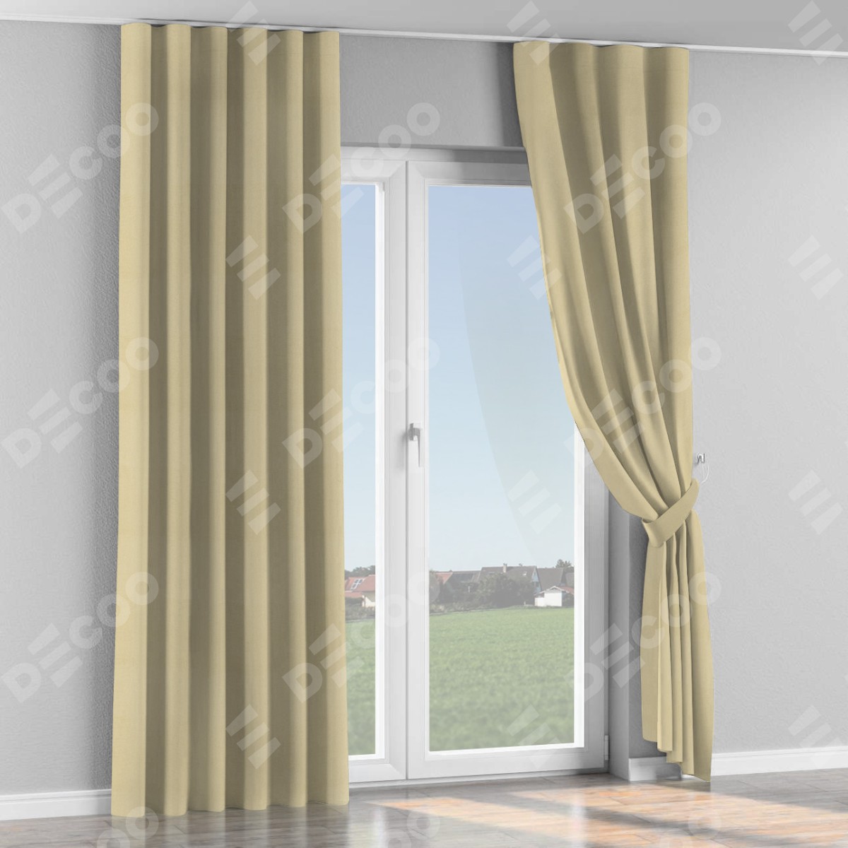 Комплект прямых штор, от производителя «Cortin», пошиты из ткани блэкаут однотонный милано латте, артикул ткани 05. С изнаночной стороны в верхней части штор пристрачивается шторная лента с декоративными складками «Волна». Для создания элегантных складок прямые шторы шьются по стандарту с коэффициентом 1:2 (на 100 см. ширины проёма 200 см. ширины ткани).