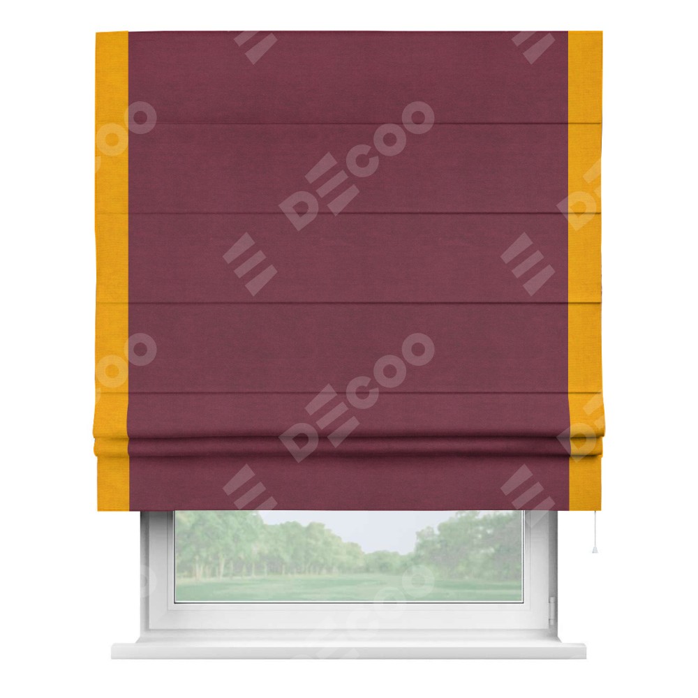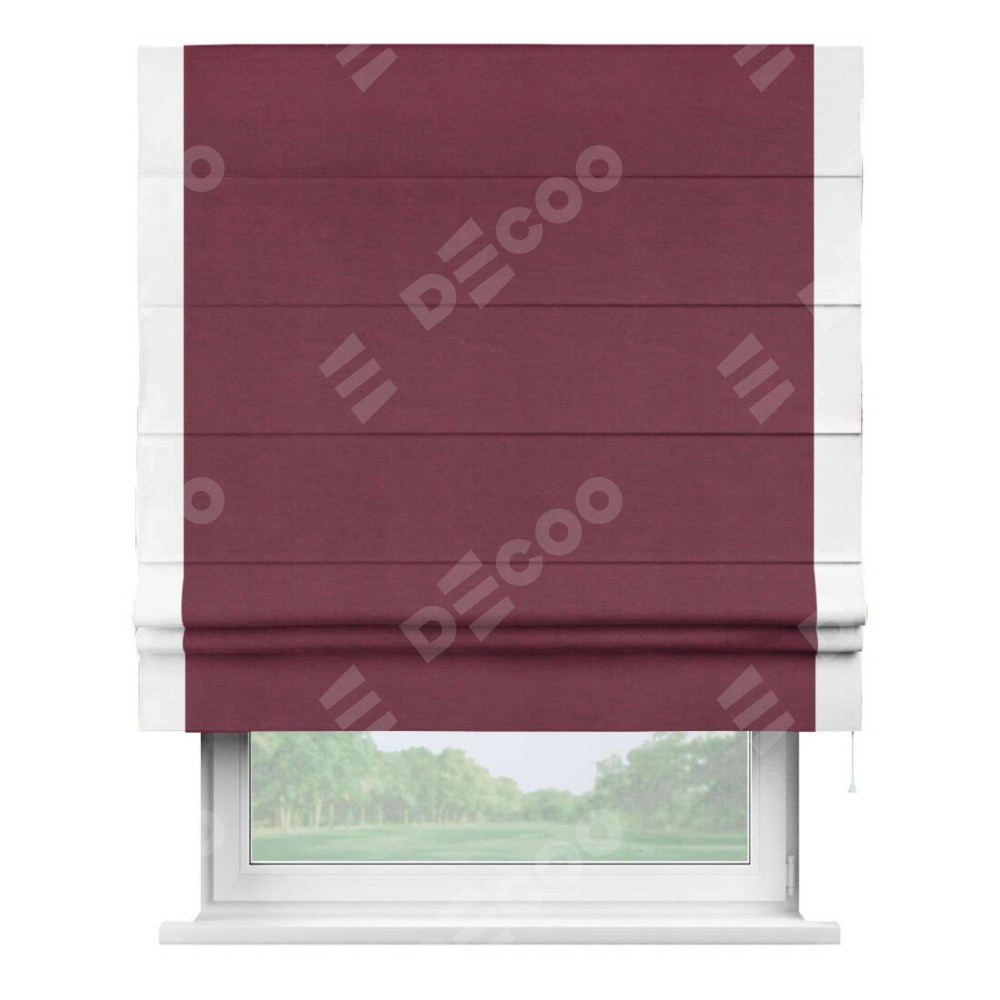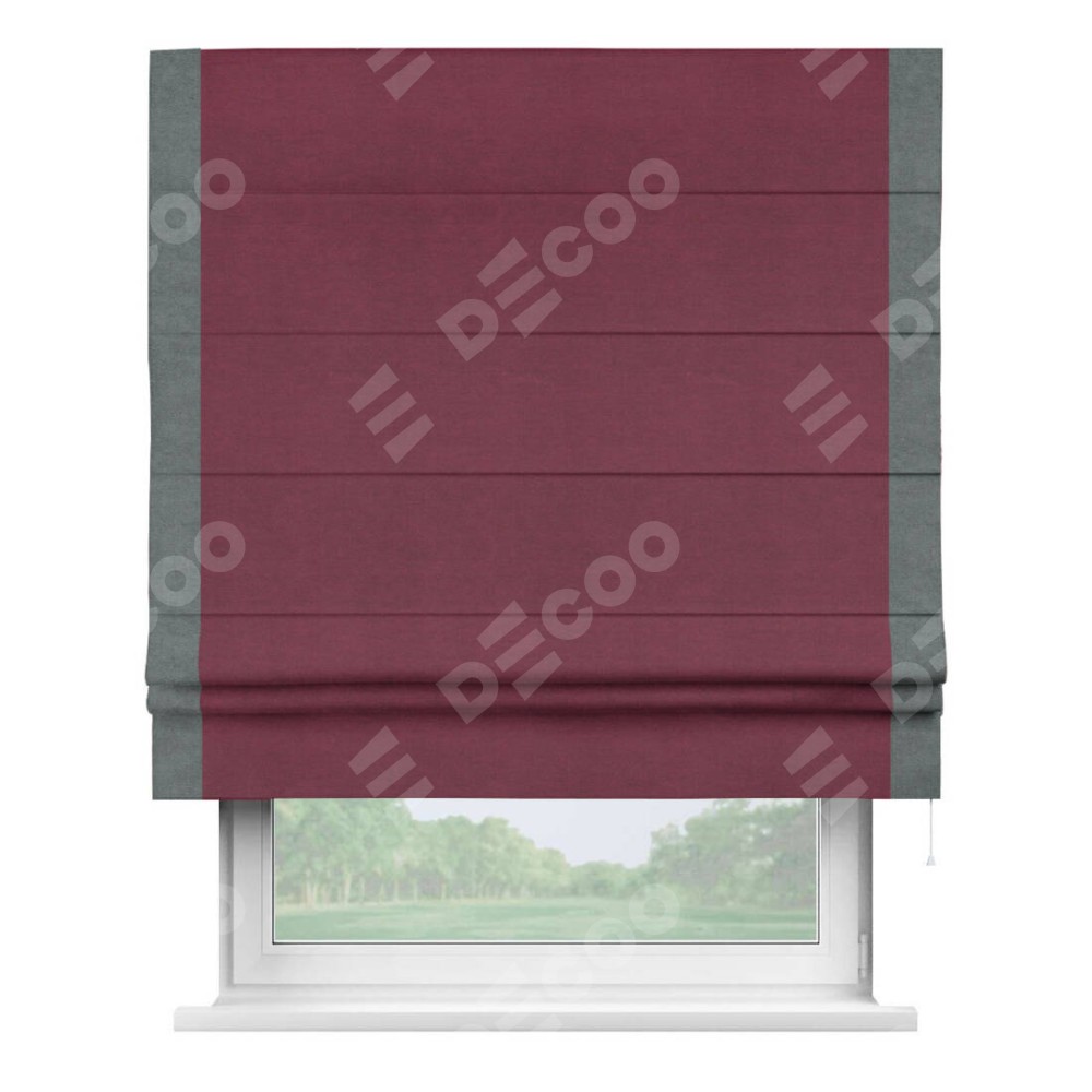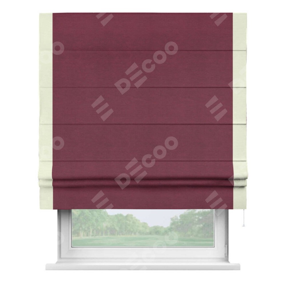 Римская штора производителя «Cortin», используется для проёма, пошита из ткани вельвет бордовый, артикул ткани 85553. Отделка шторы кантом «Стрим Дуо», ткань для канта используется из вельвета разной расцветки на выбор. Имеет универсальный механизм и подходит для монтажа: на потолок, на стену и в нишу.