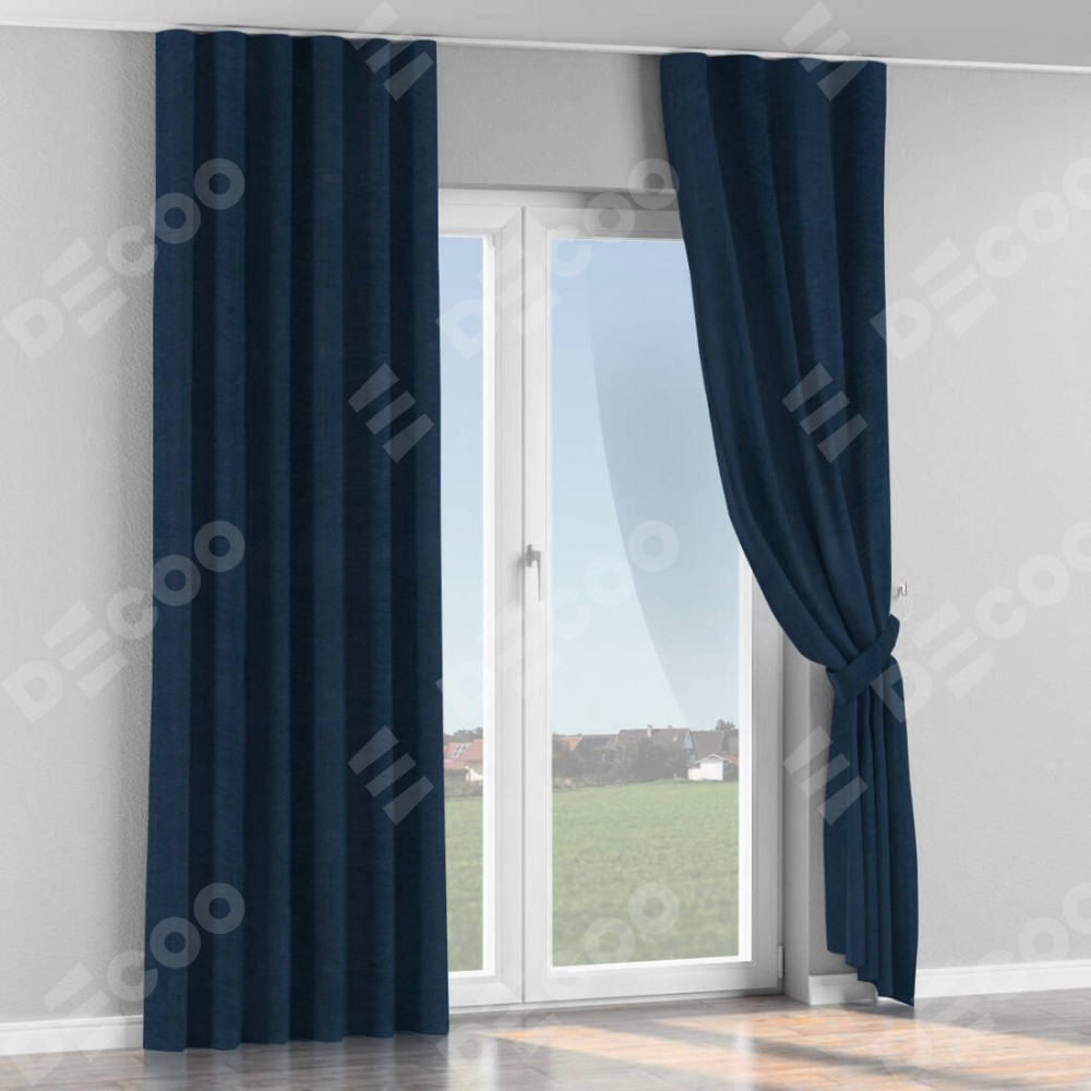 Комплект прямых штор, от производителя «Cortin», пошиты из ткани софт однотонный тёмно-синий, артикул ткани 33111. С изнаночной стороны в верхней части штор пристрачивается шторная лента с декоративными складками «Волна». Для создания элегантных складок прямые шторы шьются по стандарту с коэффициентом 1:2 (на 100 см. ширины проёма 200 см. ширины ткани).