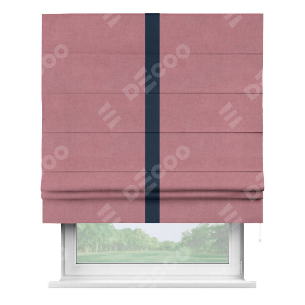 Римская штора производителя «Cortin», используется для проёма, пошита из ткани вельвет брусника, артикул ткани 85550. Отделка шторы кантом «Хайвей», ткань для канта используется из вельвета разной расцветки на выбор. Имеет универсальный механизм и подходит для монтажа: на потолок, на стену и в нишу.