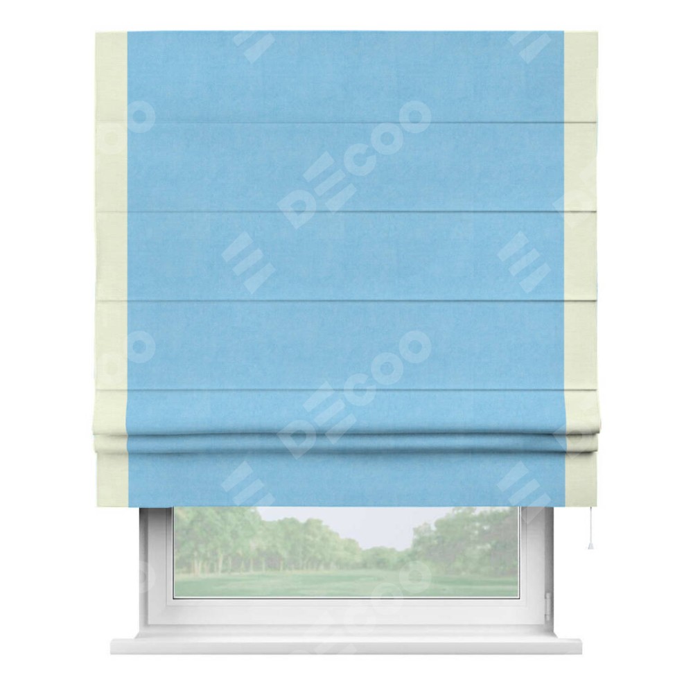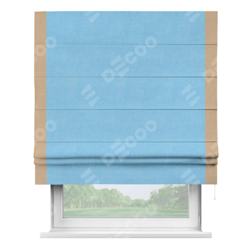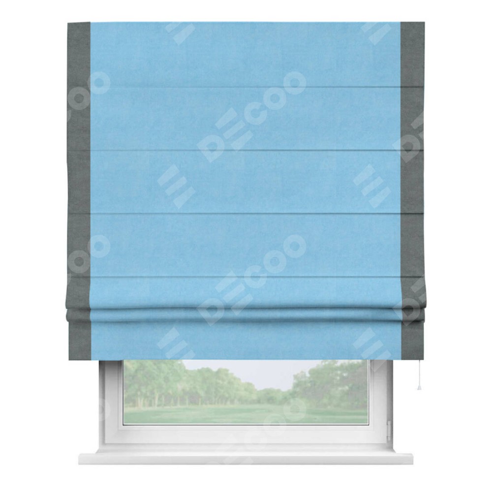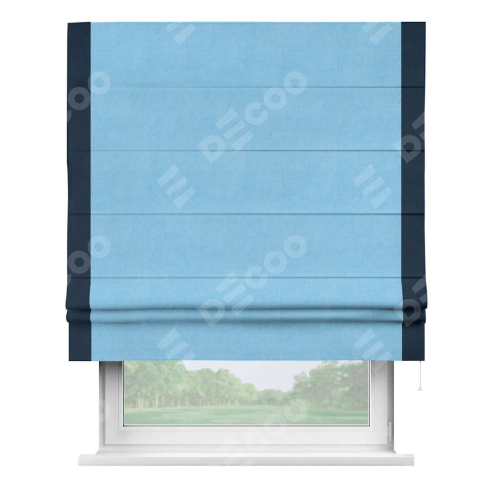 Римская штора производителя «Cortin», используется для проёма, пошита из ткани вельвет голубой, артикул ткани 85544. Отделка шторы кантом «Стрим Дуо», ткань для канта используется из вельвета разной расцветки на выбор. Имеет универсальный механизм и подходит для монтажа: на потолок, на стену и в нишу.