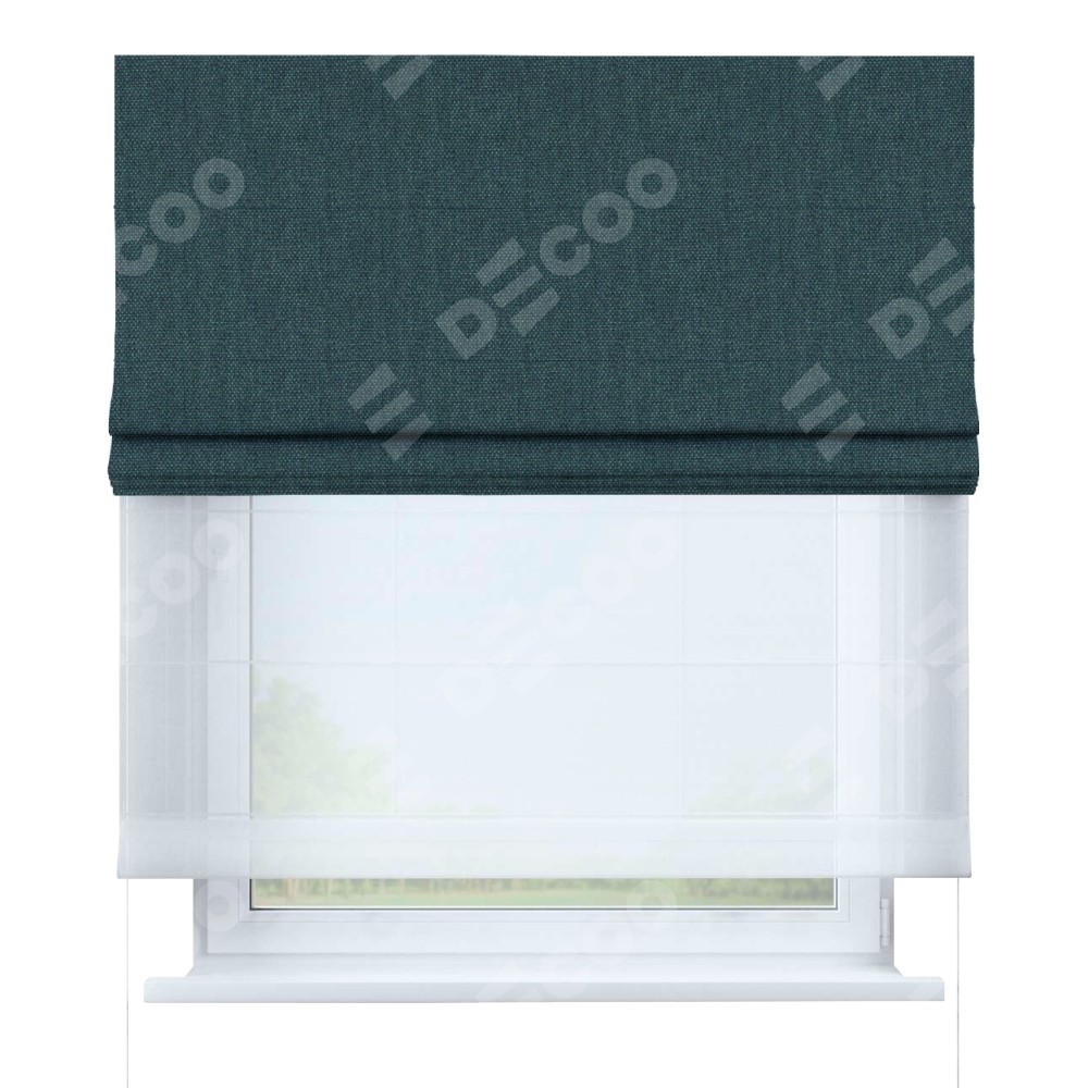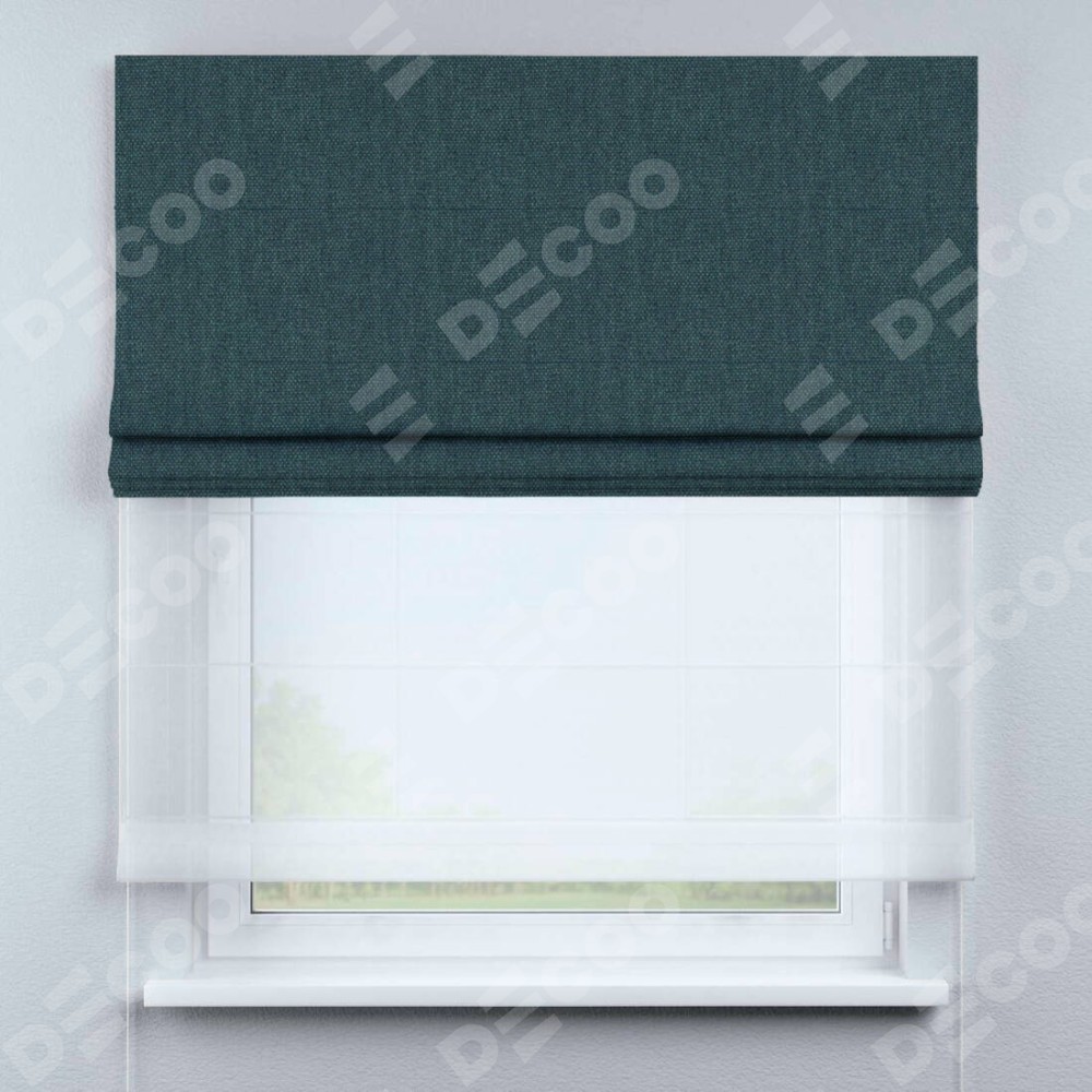 Римская штора день-ночь производителя «Cortin», используется для проёма, пошита из двух полотен, с лицевой стороны лён димаут серо-синий артикул 03238, вторая ткань тюль (по стандарту комплектуется тюль белого цвета артикул V-01). Имеет универсальный механизм и подходит для монтажа: на потолок, на стену и в нишу.