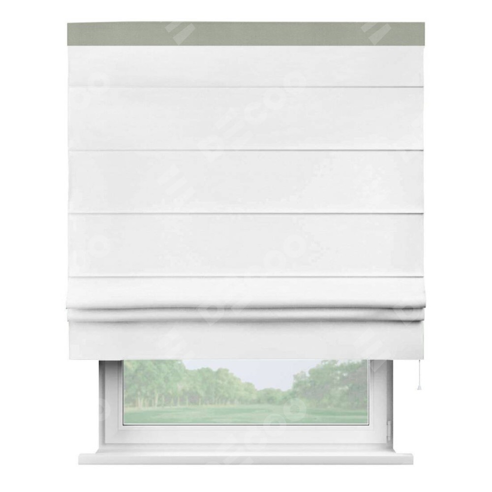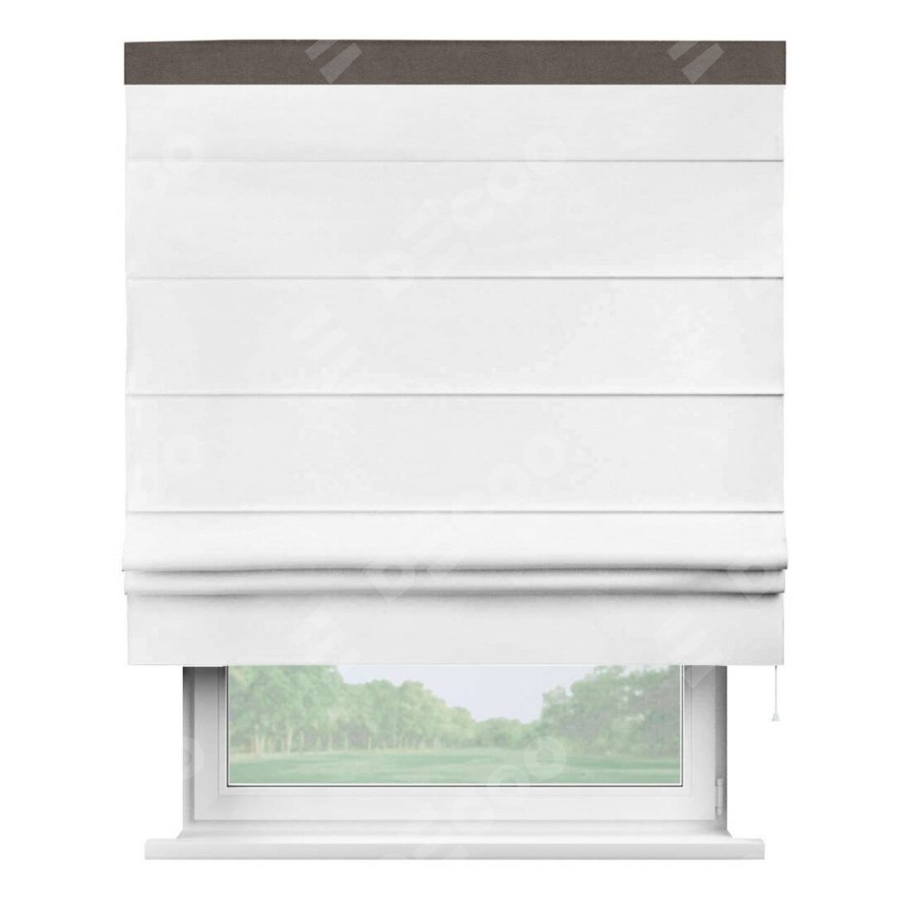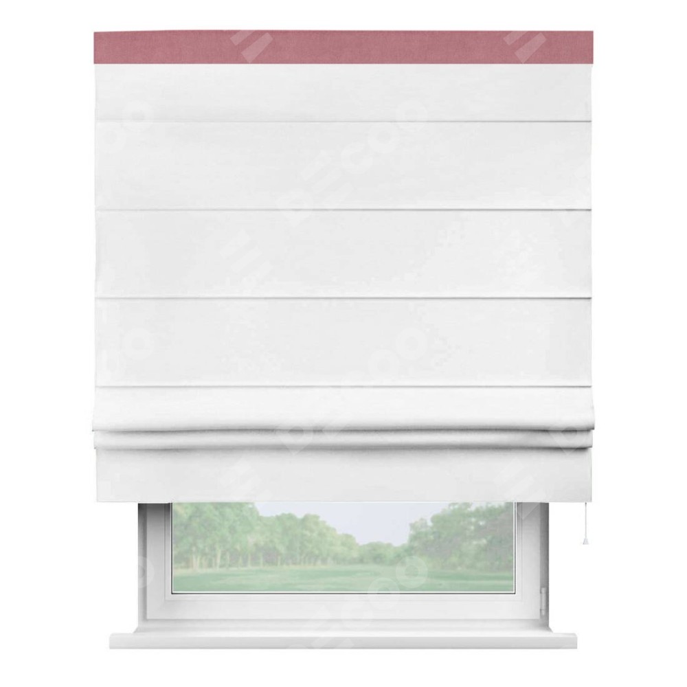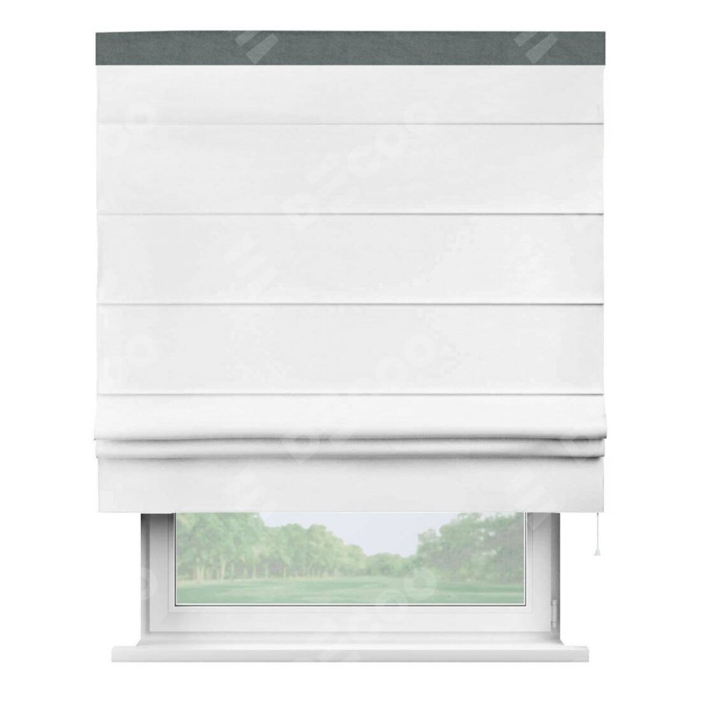 Римская штора производителя «Cortin», используется для проёма, пошита из ткани вельвет дымчато-белый, артикул ткани 85535. Отделка шторы кантом «Кинг», ткань для канта используется из вельвета разной расцветки на выбор. Имеет универсальный механизм и подходит для монтажа: на потолок, на стену и в нишу.