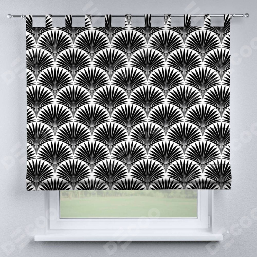 Римская штора производителя «Cortin», используется для проёма, пошита из ткани блэкаут с нанесением сублимационной печати «Арт-деко листья черный». Данная модель пошита на петлях, комплектуется на выбор круглым карнизом и подходит для монтажа на стену. Римская штора на петлях имеет простую систему регулировки высоты, отличительным преимуществом данной модели является простой способ монтажа. Достаточно повесить ее на трубу и штора готова!
