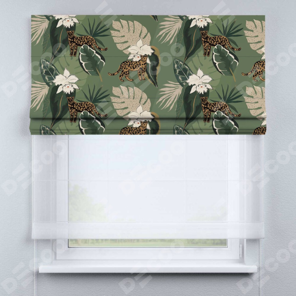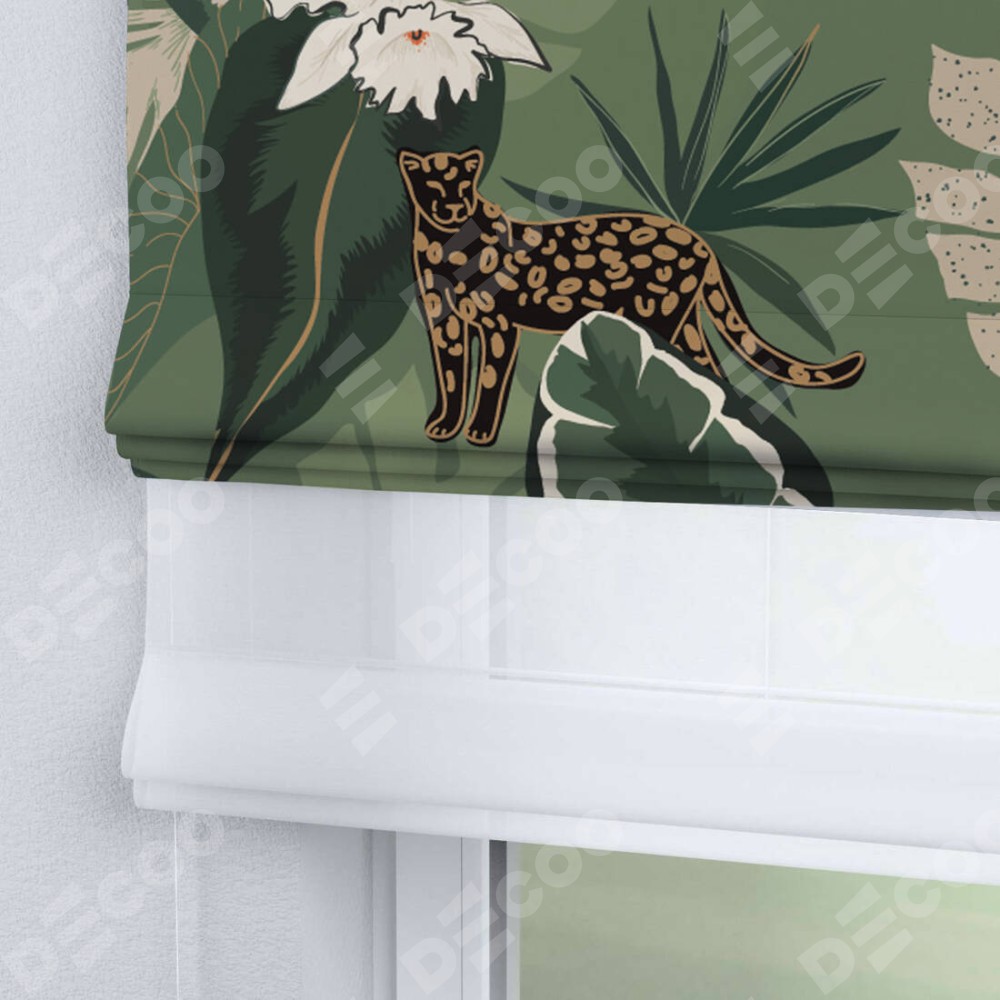 Римская штора день-ночь производителя «Cortin», используется для проёма, пошита из двух полотен, с лицевой блэкаут с нанесением сублимационной печати «В тропическом лесу», вторая ткань тюль (по стандарту комплектуется тюль белого цвета артикул V-01). Имеет универсальный механизм и подходит для монтажа: на потолок, на стену и в нишу.