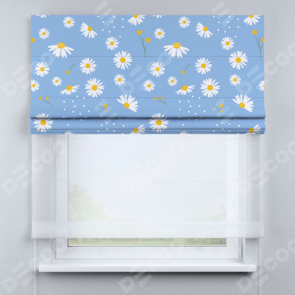 Римская штора день-ночь производителя «Cortin», используется для проёма, пошита из двух полотен, с лицевой блэкаут с нанесением сублимационной печати «Ромашки на голубом», вторая ткань тюль (по стандарту комплектуется тюль белого цвета артикул V-01). Имеет универсальный механизм и подходит для монтажа: на потолок, на стену и в нишу.