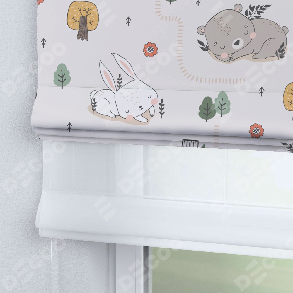 Римская штора день-ночь производителя «Cortin», используется для проёма, пошита из двух полотен, с лицевой блэкаут с нанесением сублимационной печати «Сладкие сны», вторая ткань тюль (по стандарту комплектуется тюль белого цвета артикул V-01). Имеет универсальный механизм и подходит для монтажа: на потолок, на стену и в нишу.