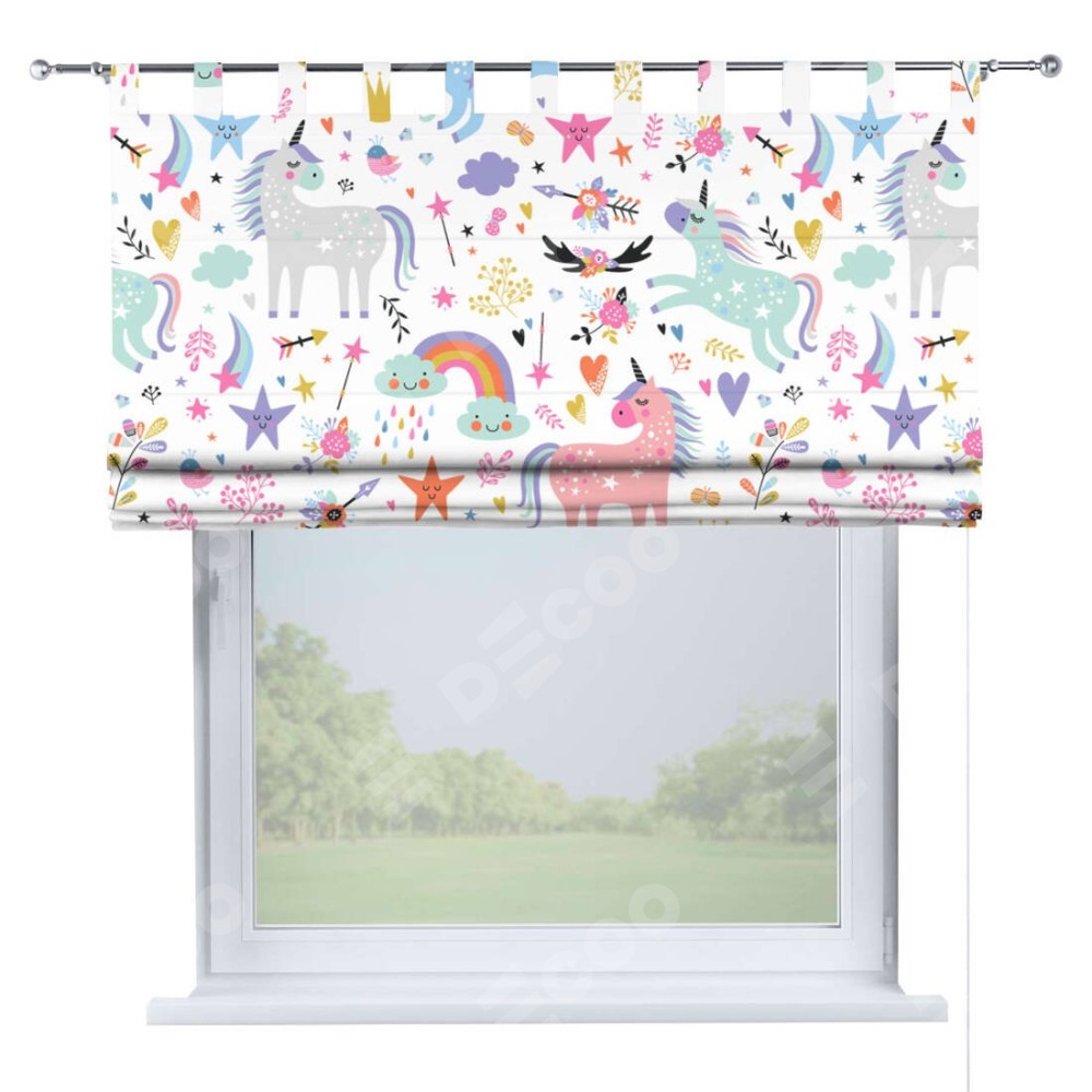 Римская штора производителя «Cortin», используется для проёма, пошита из ткани блэкаут с нанесением сублимационной печати «Радужные единороги». Данная модель пошита на петлях, комплектуется на выбор круглым карнизом и подходит для монтажа на стену. Римская штора на петлях имеет простую систему регулировки высоты, отличительным преимуществом данной модели является простой способ монтажа. Достаточно повесить ее на трубу и штора готова!
