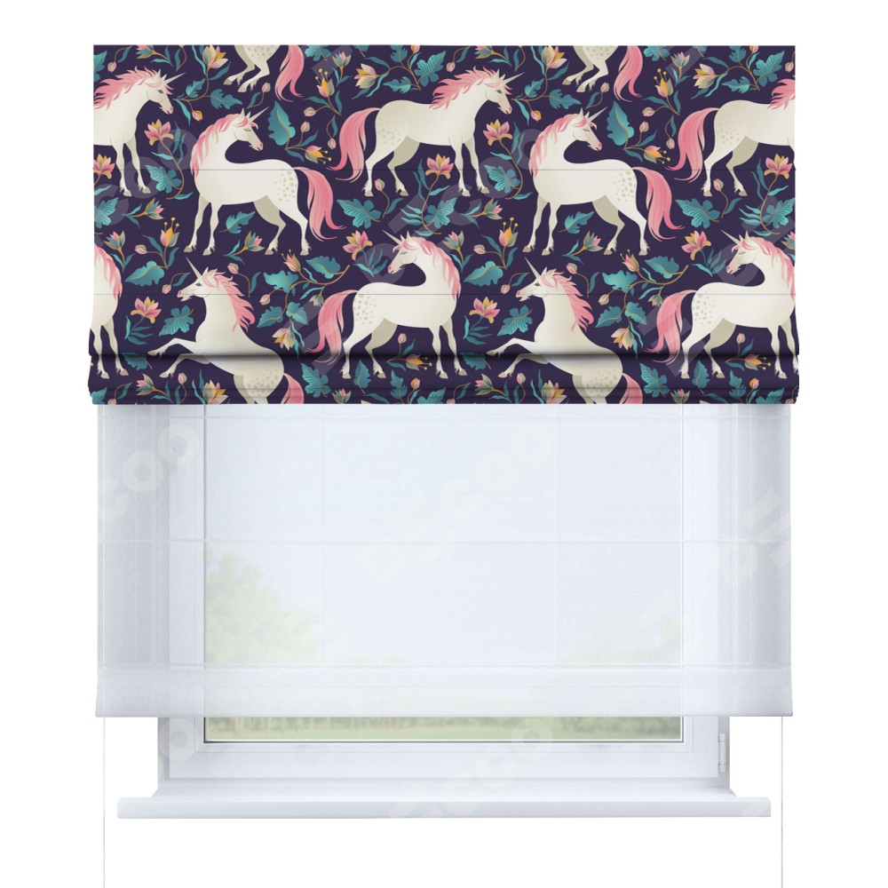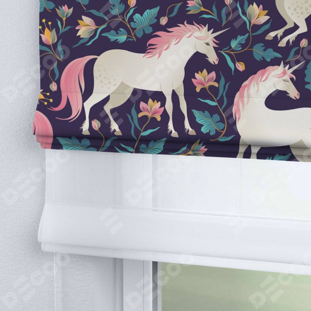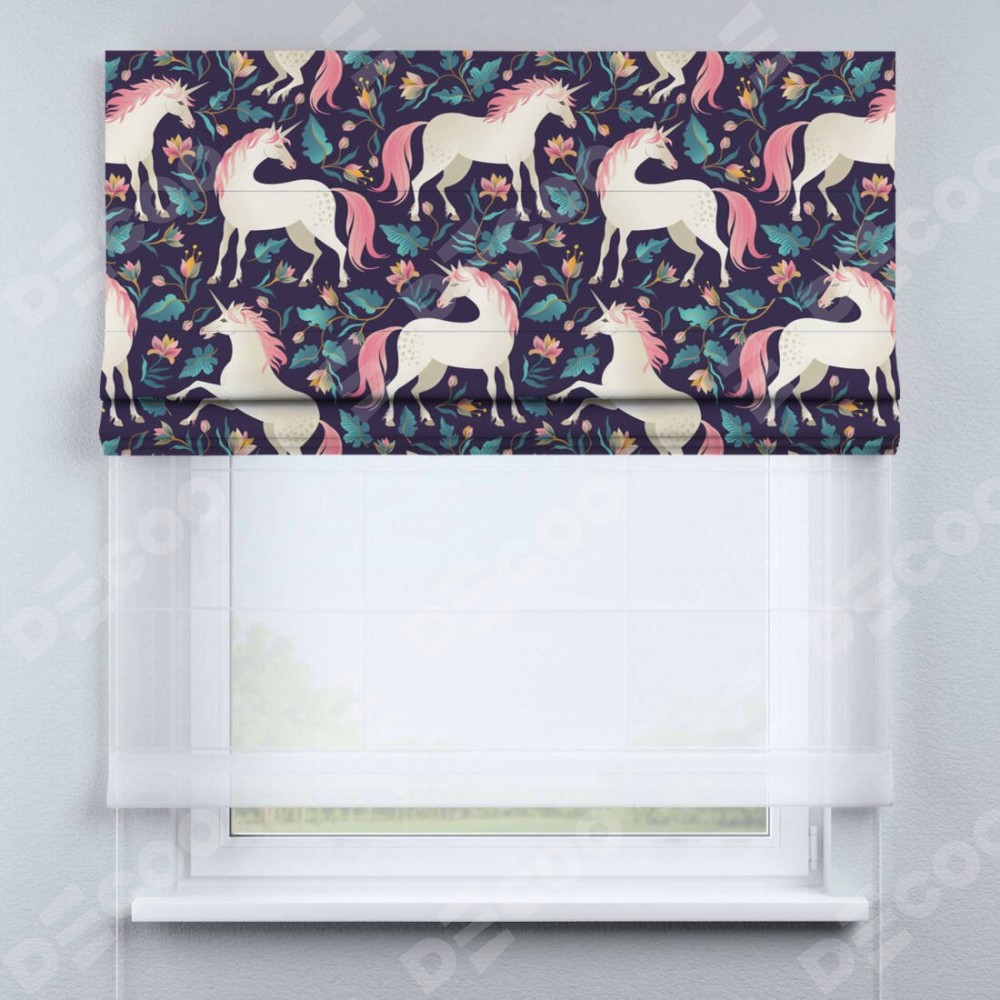 Римская штора день-ночь производителя «Cortin», используется для проёма, пошита из двух полотен, с лицевой блэкаут с нанесением сублимационной печати «Сказочные единороги», вторая ткань тюль (по стандарту комплектуется тюль белого цвета артикул V-01). Имеет универсальный механизм и подходит для монтажа: на потолок, на стену и в нишу.