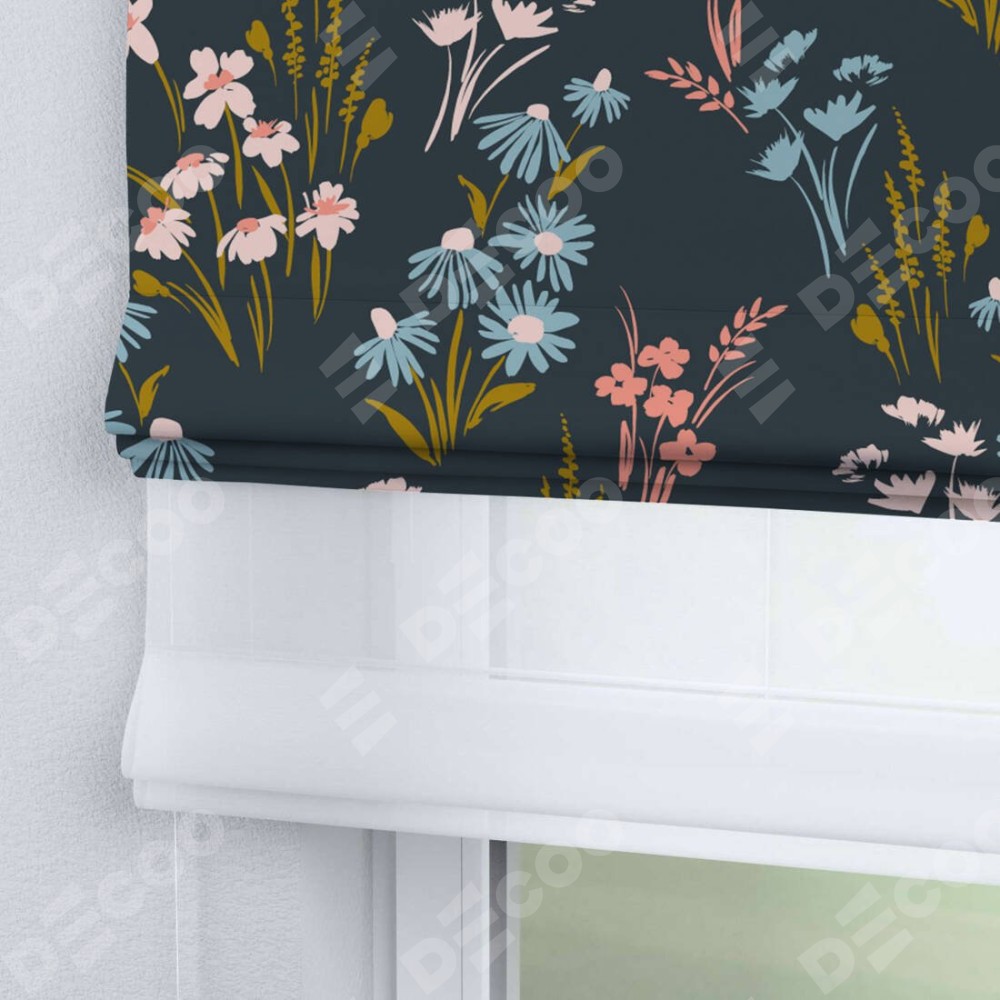 Римская штора день-ночь производителя «Cortin», используется для проёма, пошита из двух полотен, с лицевой блэкаут с нанесением сублимационной печати «Чарующие цветы», вторая ткань тюль (по стандарту комплектуется тюль белого цвета артикул V-01). Имеет универсальный механизм и подходит для монтажа: на потолок, на стену и в нишу.